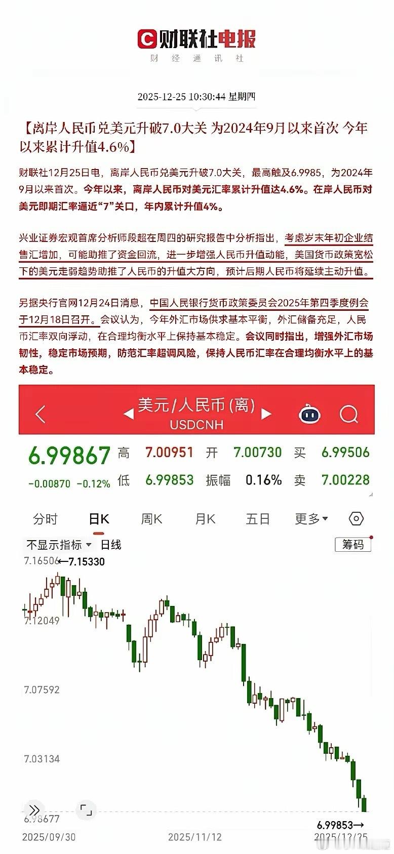 大利好!大利好来了!人民币汇率迎来重大突破了…不出意外的话,大A股要大爆发了,有望迎来一波大行情了…上午10点30分,历史一刻到来了,离岸人民币兑美元升破7.0大关,为2024年9月以来首次,这个消息对于中国资产来说是重大利好,对于大A股也是火上加油了,回想一下2020年底到2021年初,正是人民币汇率持续走强,从而吸引北向资金大幅流入中国市场,推动了A股走出了一波机构性行情,相信这次随着人民币汇率持续上涨,大A股有望复制2021年的走势,甚至超越它,总而言之,人民币汇率升值,外资会持续流入中国市场,港股和A股将受益明显,尤其是有利于大盘蓝筹和金融消费核心资产,外资的增量资金和市场情绪都已经点燃,是时候来一波了!股民们!坐稳扶好!受此利好消息影响,预计A股要起飞了,大金融、大消费等核心公司有望火力全开了!