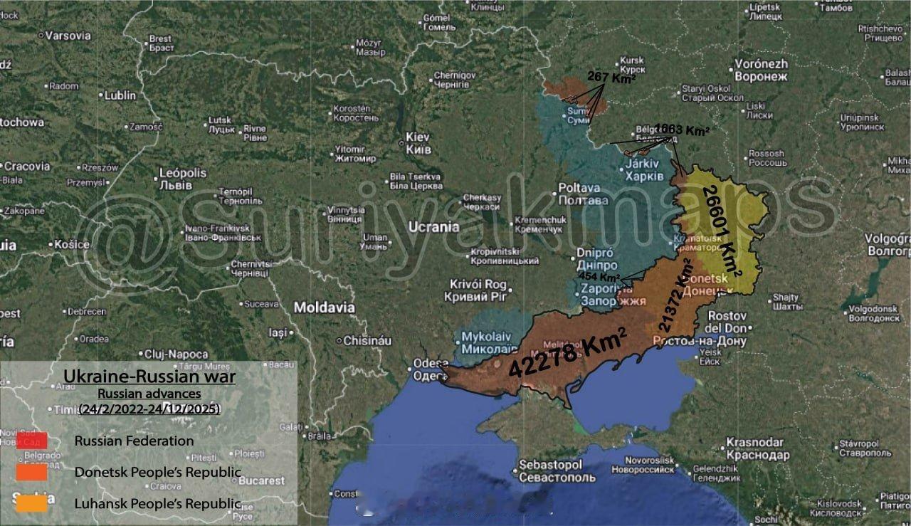 据媒体统计,截止2025年12月24日,也就是俄乌战争爆发1400天后,俄罗斯控制着91861平方公里的乌克兰领土,占乌克兰国土面积的15.22%(如果算上克里米亚半岛则为19.69%): - “顿涅茨克共和国”控制着21372平方公里(占顿涅茨克州面积的80.6%)。 - “卢甘斯克共和国”控制着26601平方公里(占卢甘斯克州面积的99.69%)。 此外,其他州的控制权分布情况如下: 赫尔松州: - 俄罗斯:20726平方公里(占比72.82%) - 乌克兰:7735平方公里(占比27.18%) 扎波罗热州: - 俄罗斯:20553平方公里(占比75.61%) - 乌克兰:6630平方公里(占比24.39%) 哈尔科夫州: - 俄罗斯:1663平方公里(占比5.29%) - 乌克兰:29752平方公里(占比94.71%) 苏梅州: - 俄罗斯:267平方公里(占比1.12%) - 乌克兰:23567平方公里(占比98.88%) 第聂伯罗彼得罗夫斯克州: - 俄罗斯:454平方公里(占比1.42%) - 乌克兰:31520平方公里(占比98.58%) 尼古拉耶夫州: - 俄罗斯:225平方公里(占比0.91%) - 乌克兰:24373平方公里(占比99.09%) 来源:Suriyak