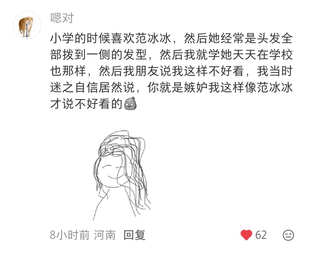 小学的时候喜欢范冰冰,然后她经常是头发全部拨到一侧的发型,然后我就学她天天在学校也那样,然后我朋友说我这样不好看,我当时迷之自信居然说,你就是嫉妒我这样像范冰冰才说不好看的