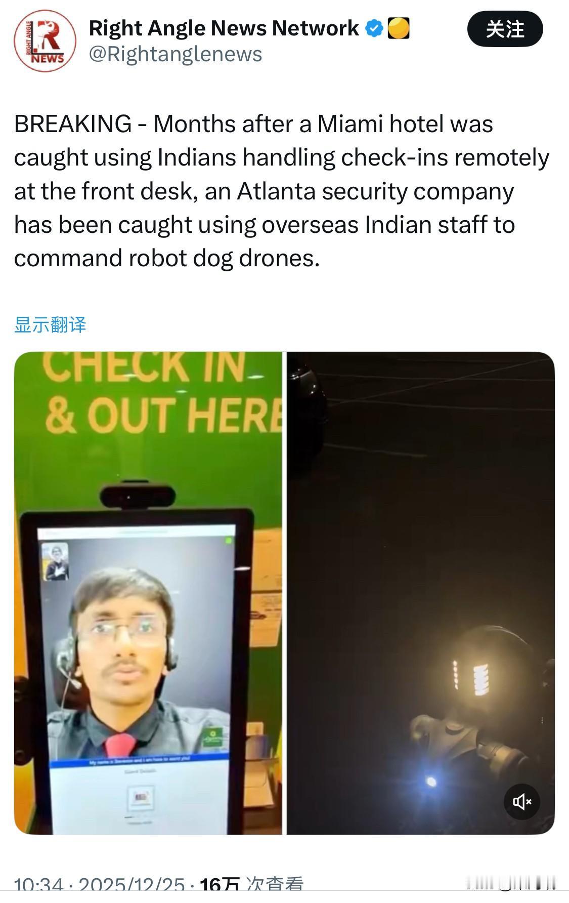 美国公司将工作外包给印度的情况屡见不鲜,近期社交媒体披露了两起代表性事件: 1、迈阿密酒店事件:几个月前,迈阿密的一家酒店被发现使用位于印度的员工远程处理前台入住和退房手续。 2、亚特兰大安保公司事件:最近,一家亚特兰大的安保公司被曝光雇佣海外印度员工远程操作安保机器人狗无人机。亚特兰大的一些建筑工地已经安装了安保机器人狗,以减少盗窃案的发生。这些机器人狗配备摄像头,能将视频传回指挥中心。