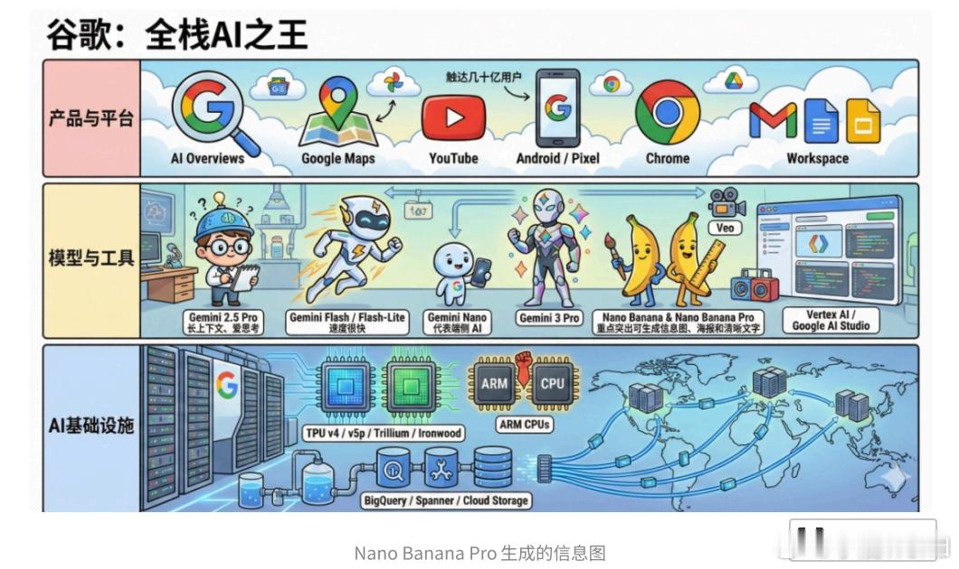 一张关于谷歌AI布局的产业图谱,标题为“新智元11月ASI产业图谱 谷歌:全栈AI之王”。图谱以圆形结构呈现,从三个维度展示谷歌的AI生态:1** 模型与工具:包含Gemini 3 Pro、Nano Banana Pro、AI Studio、Veo、NotebookLM等,覆盖从大模型到开发工具的全链条;2** 产品与平台:涉及谷歌搜索、谷歌地图、Chrome、YouTube、Android等,体现AI在谷歌核心产品中的深度集成;3** AI基础设施:涵盖TPU、AI Hypercomputer、谷歌云(Google Cloud),为AI研发与应用提供底层算力和云服务支持。这张图谱直观呈现了谷歌在AI领域“从模型研发到产品落地再到基础设施支撑”的全栈布局,凸显其在AI生态中的综合优势。
