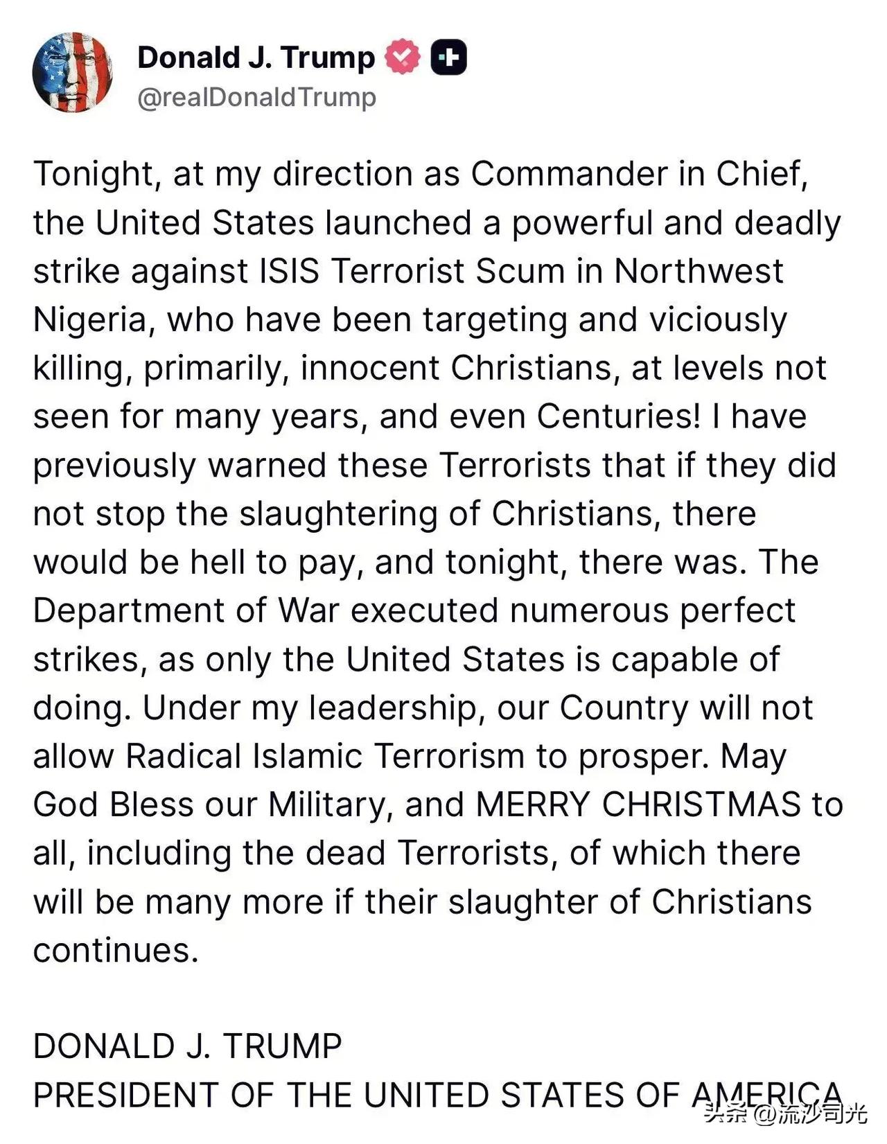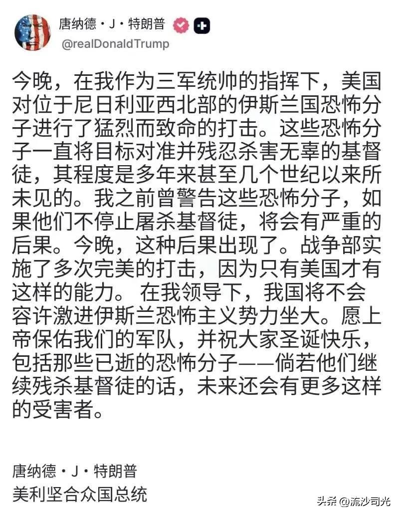 美国对尼日利亚发动空袭,目标是ISIS武装分子,他指责这些武装分子杀害基督徒!特朗普称此次行动是果断的,并警告说,如果暴力事件继续发生,将会有更多袭击发生。 特朗普:今晚,在我作为三军统帅的指挥下,美国对位于尼日利亚西北部的伊斯兰国恐怖分子进行了猛烈而致命的打击。这些恐怖分子一直将目标对准并残忍杀害无辜的基督徒,其程度是多年来甚至几个世纪以来所未见的。我之前曾警告这些恐怖分子,如果他们不停止屠杀基督徒,将会有严重的后果。今晚,这种后果出现了。战争部实施了多次完美的打击,因为只有美国才有这样的能力。在我领导下,我国将不会容许激进伊斯兰恐怖主义势力坐大。愿上帝保佑我们的军队,并祝大家圣诞快乐,包括那些已逝的恐怖分子——倘若他们继续残杀基督徒的话,未来还会有更多这样的受害者。唐纳德·J·特朗普美利坚合众国总统尼日利亚局势
