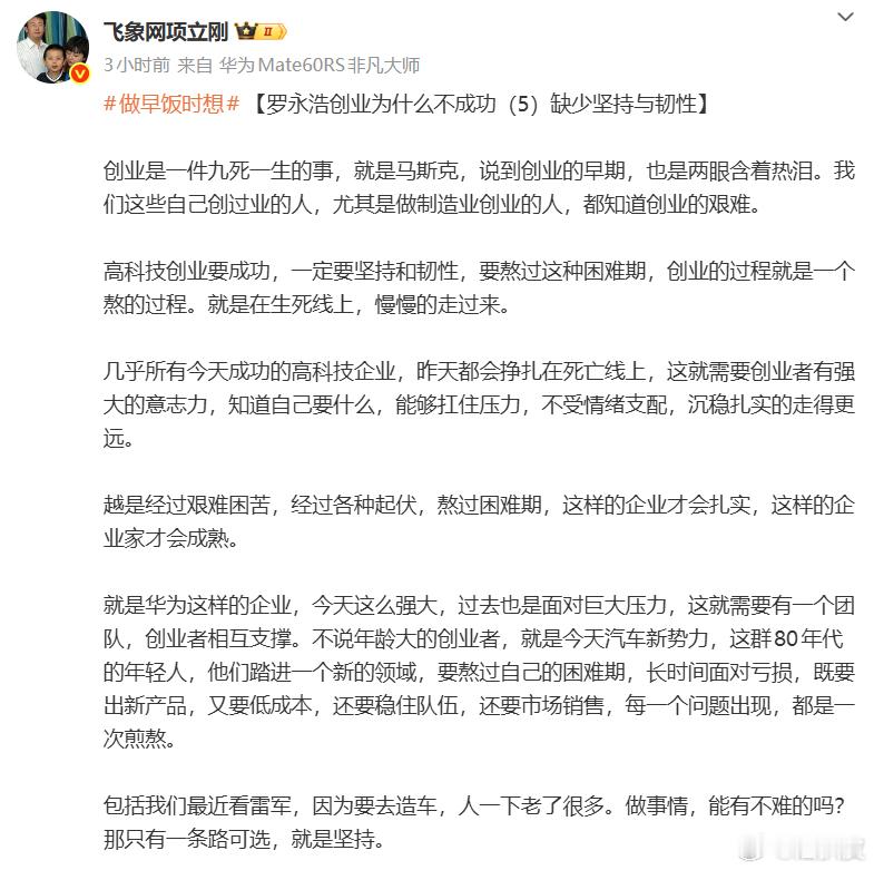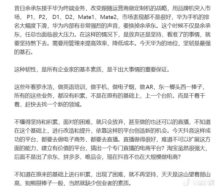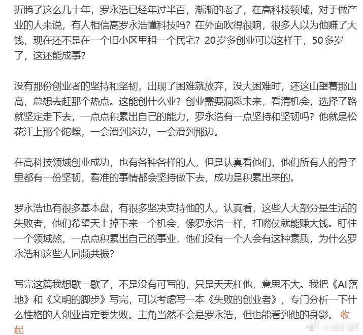 罗老师之前只是在在朋友圈吐槽了一下上海电信,可曾想被好事者截图转到了社交媒体一下就发酵上热搜了,主要还是罗老师影响足够大稍微一点动静就上了热榜。然后就是所谓的通信行业专家也是看到后,对罗老师吐槽宽带做了一些个人分析和点评,分析的也是头头是道,但有一点,推测有点过于主观,没有去实地考察就做出很肯定的判断有点略失偏颇,给人感觉好像是在为上海电信解围。后续接下来才有罗老师对项老师的一些微词,所有人都看的到,后面接下来就是项老师对罗老师本人的一些更失偏颇的评价,非常极端,被骂了也是理所应当。通篇强调创业的重点在于坚持,没有一点自己的见解,看完感觉像是抄的哪本成功人士的自传。