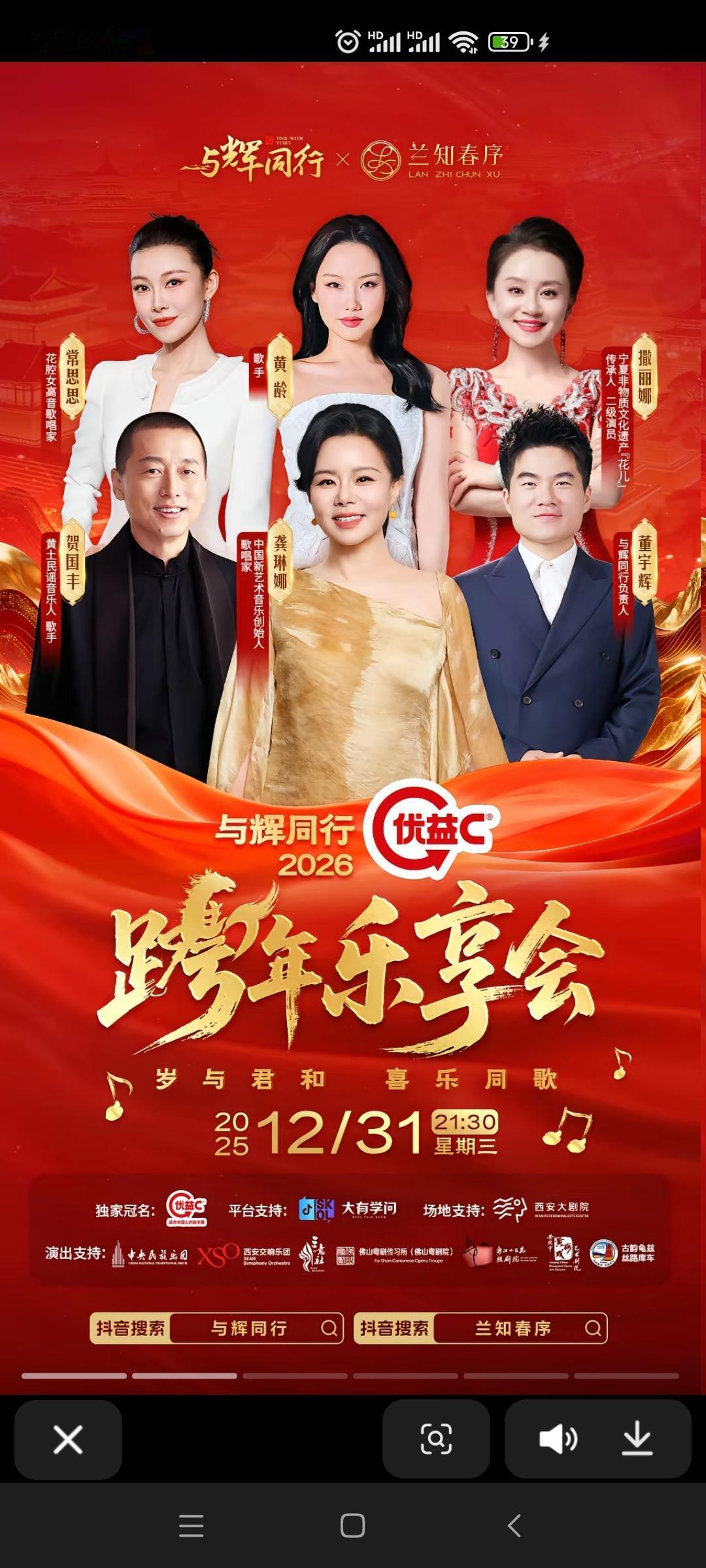 与辉同行跨年悦享会官宣了! 演出地点:西安大剧院 演出时间:2025年12月31日21:30 多名大咖参加: 有歌唱家龚琳娜, 花腔女高音歌唱家常思思, 宁夏非遗花儿传承人2级演员撒丽娜, 歌手黄龄, 黄土民谣音乐人歌手贺国丰 演出支持有: 中央民族乐团, 西安交响乐团, 佛山粤剧院, 安庆黄梅戏艺术剧院 …… 就这些响当当的名字,响当当的乐团就给大家带来了惊喜,是值得大家期待的。 当然,估计给大家带来更大惊喜的一定是董宇辉,不知道他又有什么特别的节目等着大家呢? 敬请期待! 董宇辉 与辉同行
