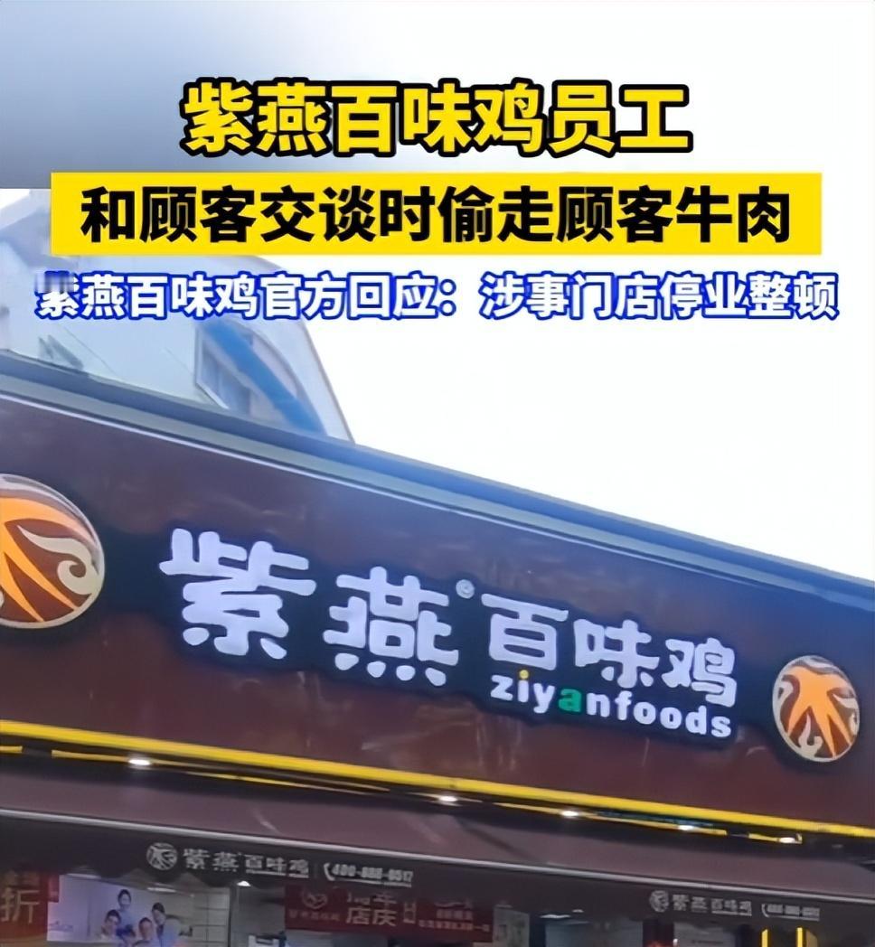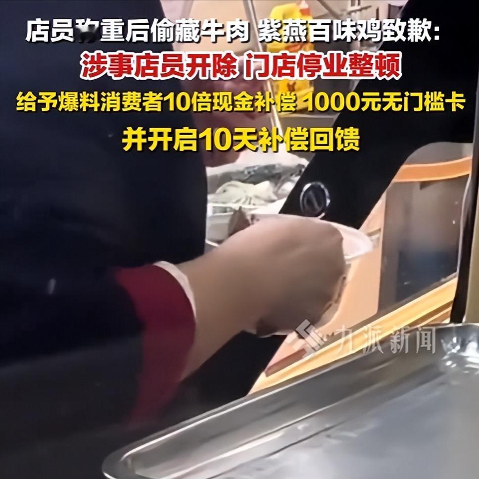 餐饮诚信底线,竟被一把牛肉彻底碾碎!紫燕百味鸡这波暗地抠秤,属实把食客当傻子耍。 12 月 24 日,南通启东凯旋路紫燕门店,网友拍下刺眼一幕。 店员称好牛肉,忙推销储值卡分散注意力,背身打包时,趁人不备熟练抓出一把牛肉藏起,动作娴熟得令人咋舌。网友直言这不是第一次,忍了许久终拍证据,当场向市监举报。 25 日记者致电门店,对方敷衍调查,品牌客服更离谱,狡辩是牛肉超重才拿,推诿态度让人火大。品牌连夜核查,次日致歉,确认店员失德违规。 涉事门店当晚停业整顿,店员火速开除,全国门店通报警示。举报顾客获十倍赔偿 + 1000 元卡,前期消费凭票领 100 元卡,后续十天消费送双倍牛肉。偷的是几两肉,坏的是口碑,熟练手法藏长期猫腻,加盟管理漏洞难辞其咎。 补偿能消损失,却难补信任裂痕。餐饮立身靠诚信,缺斤少两凉人心,唯有守住底线,才能留住食客!