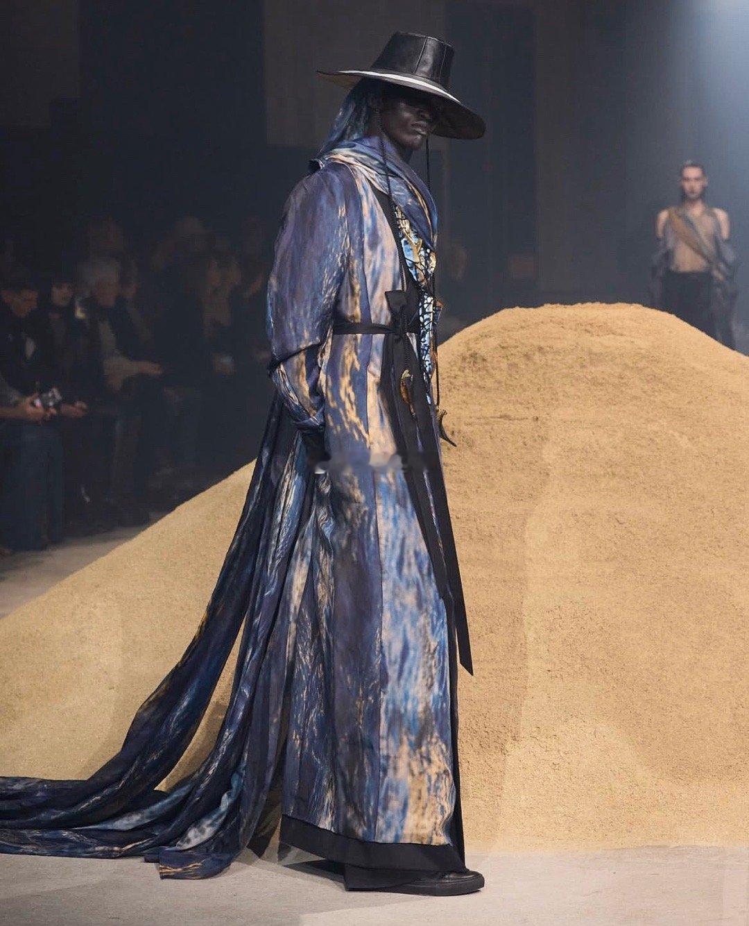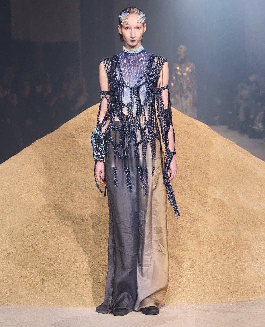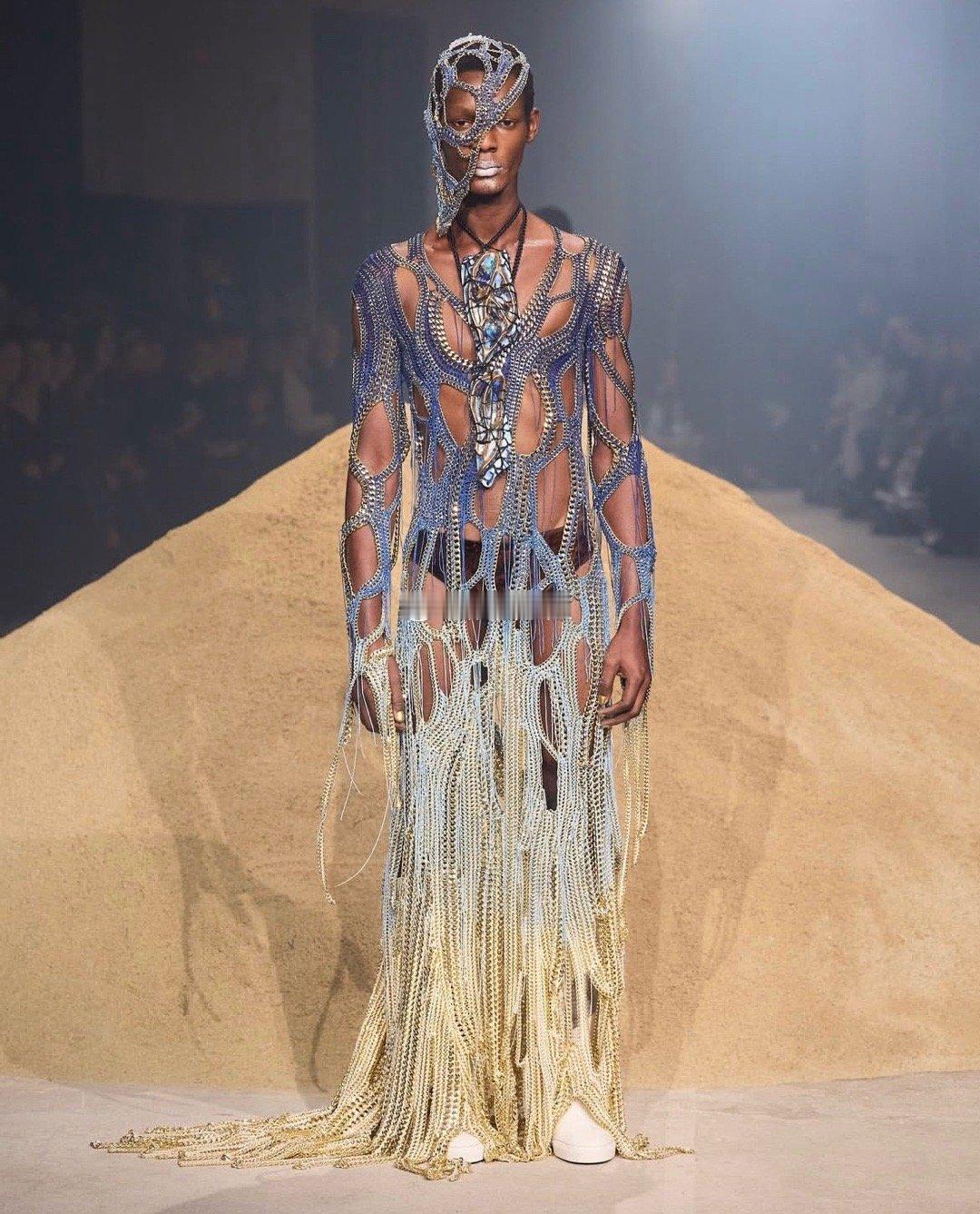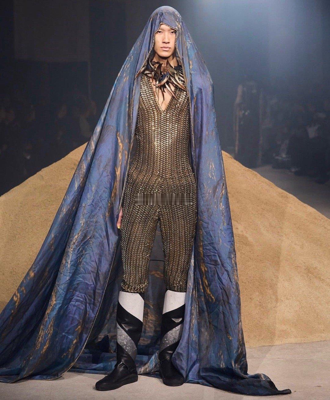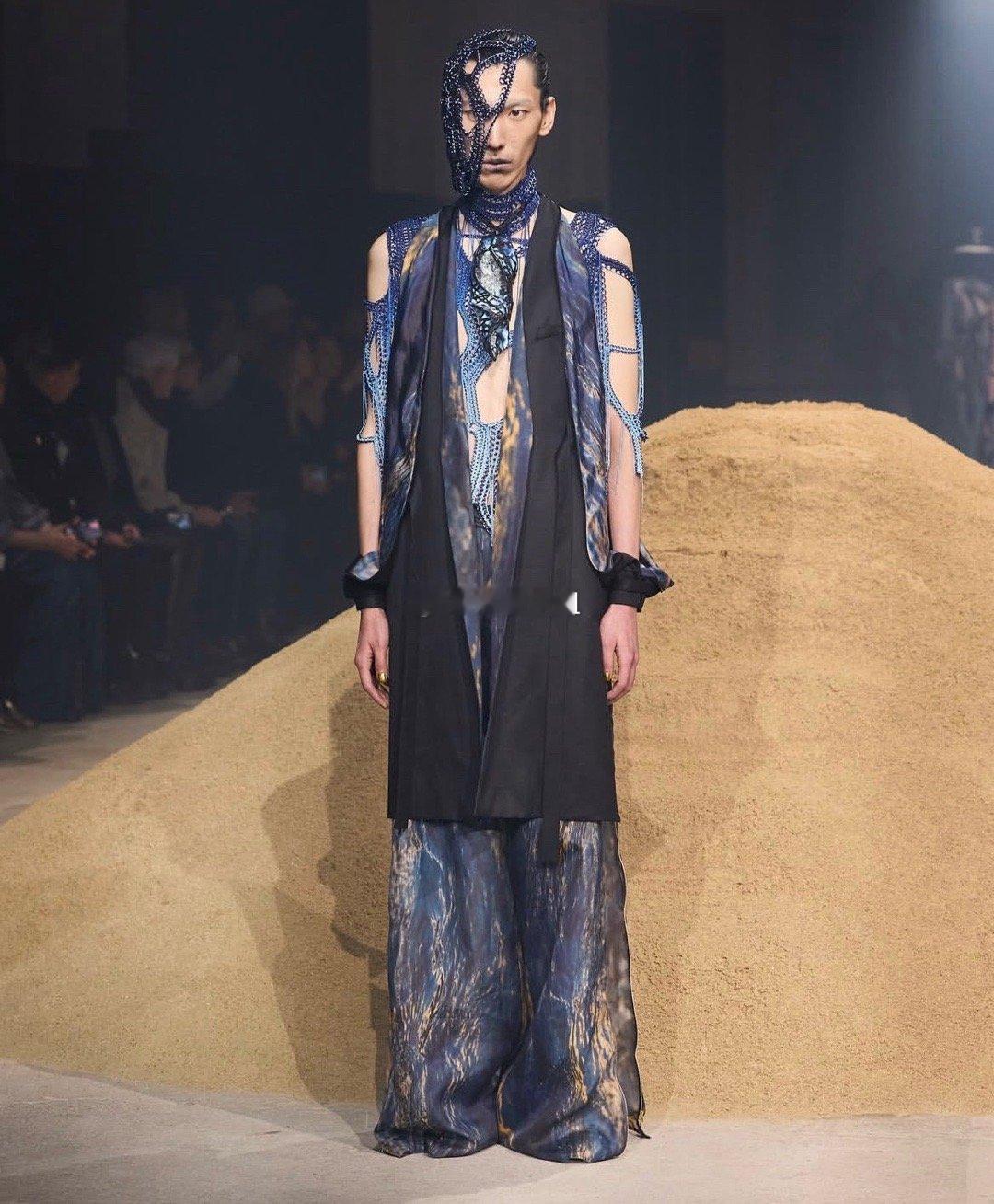 在撒哈拉沙漠迷失方向的设计师,带回了人类文明在时间尽头的倒影。Yuima Nakazato 2025春夏高定系列 “FADE” ,于巴黎高定周谱写了一曲献给消逝文明的未来大秀。这个系列的灵感,始于设计师中里唯马在撒哈拉沙漠亲历的、被金红色暮光吞没地平线的迷失时刻。无垠沙海,在昼夜交替中呈现的蓝紫色、紫灰色与熔金色彩,这些色彩构成了他幻想中末世的基本色调,这种辉煌与寂灭交织的颜色与“未来暮色”不谋而合。陶瓷废墟:系列最震撼的焦点,是将坚硬的陶瓷方块制成外套。它们象征着被摧毁的现代城市遗迹,是文明的墓碑,却也被赋予重生的隐喻。科技织造:品牌核心的 “科技重塑手工” 理念深入肌理。系列采用日本传统织布机与现代科技结合,运用环保纤维与AI数码印花技术,在传承与未来间找到平衡。再生宣言:践行可持续时尚,系列运用 “DFT废旧衣物再生技术” ,将从非洲回收的旧衣物重塑为全新的高定作品,让记忆在布料中延续。“FADE”超越了时尚范畴。它是对人类文明脆弱性的沉思,探讨在注定的消逝中,如何通过创造寻找永恒。陶瓷的永恒与布料的脆弱,科技的精准与手工的温度,在此激烈碰撞,最终凝聚成一种充满哲思的末日浪漫。未来暮色风格大赏2025年色彩记忆