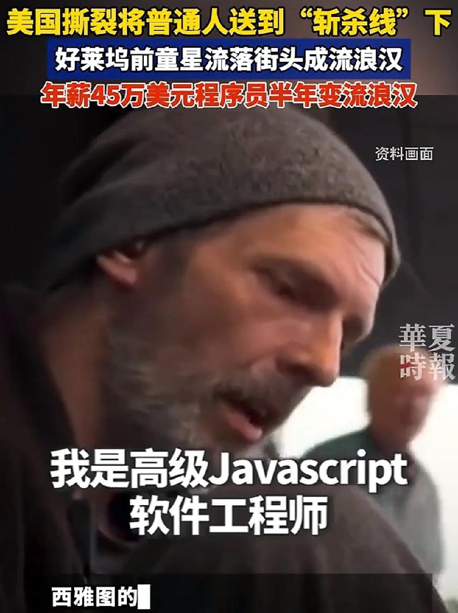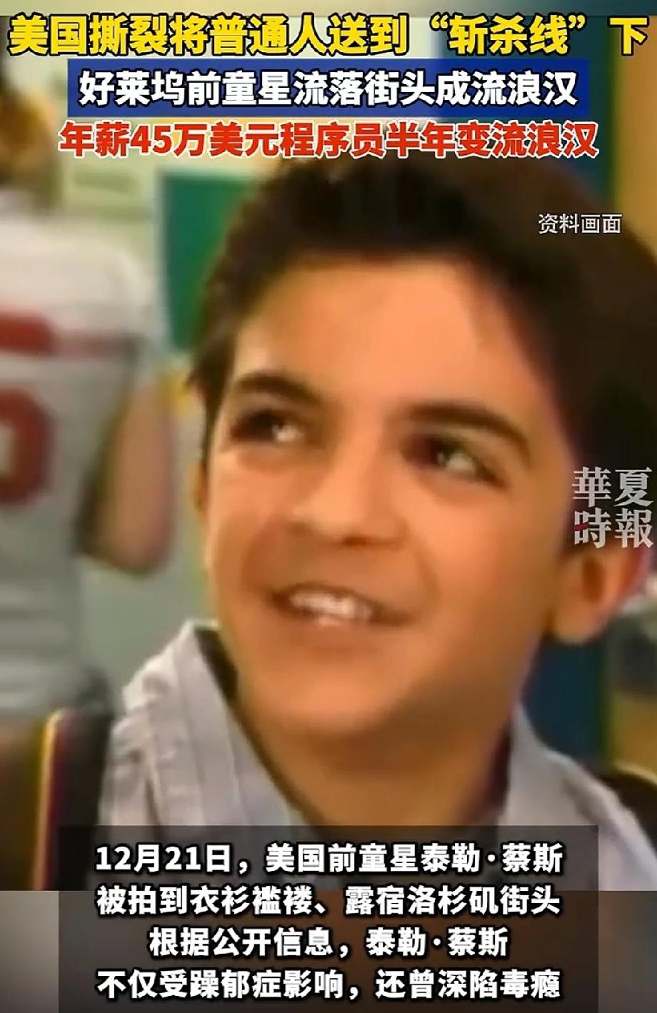 送到斩杀线下:美前童星沦为流浪汉 平安夜,当美国富人在豪宅切火鸡时,现实却很残酷。曾经的美前童星泰勒·蔡斯,竟沦为几十万流浪汉大军中的一员,衣衫褴褛、眼神空洞。与此同时,纽约长岛还有两名无家可归者躲垃圾箱避寒,被当垃圾活活挤压致死。 这就是所谓的“美国斩杀线”。很多美国人财务处于紧平衡,扣除开支所剩无几,一旦意外、失业、生病,财务就会跌破临界值,社会一连串机制会“迫使”他们流落街头。像西雅图程序员杰克,年薪45万,一场裁员、一场急诊就陷入困境。流浪汉平均生存时间仅三到五年,这“斩杀线”真如绞肉机般残酷。