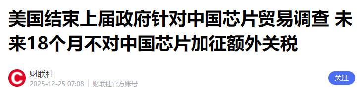 快讯, 美国突然宣布了! 12月25日,美国方面突然宣布:“2027年会对中国芯片加税,但接下来18个月先不加。”——这话一出,不少人有点懵:这到底是松了口,还是往后推了? 美国的产业链短板,这可是个绕不开的硬伤。之前特朗普在采访里都直言不讳,说美国当年愚蠢地把芯片制造业外移,现在台湾几乎生产了全球100%的先进芯片,这事儿太丢脸了。 这话虽然有点夸张,但确实戳中了美国的痛点——如今全球5nm及更先进制程的手机芯片,75%以上都靠台积电代工,美国本土连一条能稳定量产先进芯片的生产线都没有。 就算是台积电在美国亚利桑那州建的工厂,砸了上千亿美元,每月也只能产出1.5万片晶圆,还得从台湾抽调核心工程师支援,生产的芯片价格比台湾厂区高30%,根本没竞争力。 美国连芯片制造的完整流程都凑不齐,比如英伟达最新的AI芯片,就算在美国生产了晶圆,最后还得运回台湾封测才能成品。 数据显示,美国本土的晶圆代工产能只占全球10%,而中国已经占到了21%,单是成熟制程的产能就足以支撑全球60%以上的汽车、家电、工业控制需求,这样的产业链差距,让美国根本没底气立刻对华加税。 产业链掉链子还只是一方面,美国本土的芯片企业更像是压垮加税计划的“最后一根稻草”。可能大家不知道,美国贸易代表办公室启动对华芯片301调查后,收到的不是企业的支持,而是一片反对声。 有报道说,超过六成的美国芯片设备商明确反对加税,12家头部半导体厂商还联名上书,警告说一旦加税,不仅会让他们失去中国这个庞大的市场,还可能导致百亿级的亏损和大规模裁员。 就拿美光来说,一边是美国政府的施压,一边是中国市场的巨大诱惑,最后还是乖乖跑去申请对华出口许可,毕竟谁也不想跟钱过不去。 要知道,中国是全球最大的芯片消费市场,不管是手机、电脑还是新能源汽车,都离不开芯片,美国企业如果因为加税被挡在门外,损失的可不是一星半点。 而且现在全球芯片行业的竞争本来就激烈,美国企业的库存已经高企,要是再失去中国市场,很可能被其他国家的企业趁机抢占份额,这种赔本买卖,企业自然不会答应,也倒逼美国政府不得不暂缓加税计划。 如果说美国的短板是“内因”,那中国芯片产业的产能碾压就是让美国不敢轻举妄动的“外因”。 可能有人觉得,中国芯片在先进制程上还有差距,但在成熟制程领域,咱们早就站稳了脚跟。 根据Yole Group的权威报告,2024年中国大陆的晶圆代工产能就已经占到了全球21%,和韩国持平,仅次于台湾地区;到了2025年,中国大陆的晶圆月产能同比增长14%,达到1010万片,占全球的35%。 中芯国际在北京、上海、天津的厂区月产能超过百万片,华虹在无锡的12英寸工厂月产能也达到10万片,而且中芯国际28纳米制程的良率高达99.999%,完全能满足市场需求。 中国的产能扩张速度全球第一,国家大基金持续注入资金支持,本土供应链的本地化率已经达到80%,光刻胶、离子注入机等关键部件都实现了突破。 这种产能优势带来的直接影响,就是全球成熟制程芯片价格回归理性,部分品类降价30%,也让美国想通过加税挤压中国企业的算盘落了空。 毕竟现在全球市场离不开中国的成熟制程芯片,要是美国执意加税,最后只会推高自己国内电子产品、汽车的价格,让民众买单,这也是美国政府不得不考虑的现实。 说到底,美国这次延迟18个月对华芯片加税,根本不是什么善意的让步,而是“打不起又放不下”的无奈之举。 一方面,自身产业链短板明显,企业反对声强烈,根本承受不起立刻加税的代价;另一方面,又不甘心看着中国芯片产业崛起,所以留了个2027年加税的尾巴,给自己找个体面的台阶。 对于咱们来说,也别被这18个月的“缓冲期”迷惑了,这不是安全期,而是备战期。美国在暂缓中低端芯片加税的同时,还在收紧高端AI芯片的出口管制,本质上还是想遏制中国芯片产业的发展。 咱们能做的,就是抓住这18个月的时间窗口,继续巩固成熟制程的优势,加快高端技术的研发,完善本土供应链,把核心技术牢牢掌握在自己手里。 毕竟,在芯片这种高科技领域,从来没有捷径可走,只有自身实力足够强,才能在未来的竞争中站稳脚跟,不被别人卡脖子。而美国这种纠结的“摆烂式”操作,最终也改变不了全球芯片产业多极化发展的大趋势。