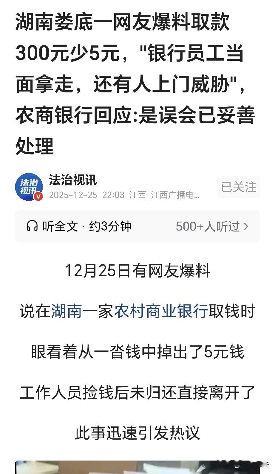 没底线了!湖南娄底,一女子到银行取300元,一共60张5元钱,可柜员递给她时,只有295元,一张5元掉在计算机旁,柜员没有给她,反而捡起钱搁进抽屉,然后离开,女子去找别的工作人员,谁知问题没有解决,双方吵了起来,女子拍视频发到网上,万万没有想到,对方找到她家地址,上门威胁,女子报警,银行: 这是误会! 女子需要300元现金,只要5元的面额,于是她来到了银行,把自己的诉求告诉了工作人员。 柜员一声不吭,在柜台后面忙碌了起来,她先在电脑上操作,之后就取出来60张5元面额的钱。 柜员把钱搁进了点钞机里,随着咔嚓点钞机开始工作,唰唰唰一阵响动,屏幕上显示是60张钱。 之后柜员又重复了这个动作,点钞机反复的点了几遍,屏幕上都显示是60张,这一回确定无误,柜员拿起钱就给女子递了出来。 谁知这时,一张5元的钞票悄无声息的从柜员手里滑落,跌落在了柜员面前的计算机的旁边。 女子在柜台的外面,把这一切看的清清楚楚,她以为是柜员没有拿好,这才导致一张5元钱掉在桌上。 女子接过钱后,她没有吭声,以为柜员会把那张把钱再拿给自己。 谁知柜员看到后拿起那一张5元,并没有递给她的意思,却自己把钱搁进了抽屉。 女子急了,赶忙要求柜员给钱,谁知柜员却说,要她把手里的钱再数一遍。 女子数了,发现就是少了一张,谁知这时,柜员离开了座位,她竟然走了。 女子傻眼,还能这样?可中间隔着玻璃,女子干着急没有办法。 她转头看到有另外两名工作人员,女子说明情况: 取300块钱只给我295元,刚刚掉一张在计算机那里。 可她不给我,又拿进去了,银行规定,离柜概不负责,我不会拿钱走人。 可工作人员认为,柜员可能以为钱是她自己的,要她等待。 女子急了,拿钱给他们看,这是59张,清清楚楚少了一张,要她给我,她却捡了五块钱就走了。 可说到最后,事情没有解决,却吵了起来,女子委屈,拿起手机拍下了视频。 女子将视频发到了网上,让大家看看她的遭遇,你就是拿错了还给我就是,你为啥捡起钱还离开了座位。 再说,银行到处都有视频监控,在柜台取钱,更是拍的清清楚楚。 验钞机上明明显示是60张5元,为啥递出来就变成了59张295元? 那一张钱明明是在给钱过程中掉了,你捡起来给我不就完了,你还叫我自己数数,我数钱时你是不是应该当场看着? 你明明看到掉落的那一张5元,你却拿回去走了,你啥意思,你不会是5块钱你都看在眼里吧? 可她万万没有想到,到了晚上,那三个工作人员,其中一人的老公,给女子打来了电话,说话难听,把她V胁了一遍。 之后,他们查到了女子的家庭住址,纠结了十几个人,来到女子家敲门。 女子打开门一看,对方人数众多,气势汹汹,一男子上来指责,说女子发视频诋毁他老婆。 女子分辩,我没有诋毁,我是发了视频,那视频是我当场拍下来的,全部属实。 可对方人多,女子只有一人,抵不过对方的七嘴八舌。 女子急了,你们这么多人,找上门来,是想干啥?现在是法治she会,不会允许你们胡来! 女子报警,警方很快就赶到了现场,听到了事件的缘由,警方给双方做了调解。 事情本身不大,警方希望双方和解,要双方都平静一下,不能因为区区5元,就这样大动干戈。 对方看事情警察出面,几个人立刻道歉,银行工作人员的那位老公表示,是他一时冲动,才做出这样的事情。 之后,那位柜员也表示道歉,说她当时不应该离开座位,应该处理完再做其他事情。 银行行长出面解释,当时柜员确实是因为有别的事情,所以才离开了座位,银行已经和女子进行了沟通,已经妥善处理了此事。 有人认为,不太相信银行员工为了贪5块钱干出这事,也许真的就是误会。 可如果是100元呢?还要不要了? 事情的关键,并不是5块钱的事,而是一种态度问题,顾客已经发现少了,柜员还把钱搁在抽屉,离开了座位。 柜员没有解决问题,这才导致了后面的矛盾,之后又找上门进行V胁,谁能接受这样的事情? 《民法典》第558条规定: 债权债务终止后,当事人应当遵循诚信等原则,根据交易习惯履行通知、协助、保M等义务。 女子到银行取钱,双方形成储蓄服务合同关系,银行不仅要履行“给钱”的主要义务,还得尽到协助、妥善处理纠纷的附随义务。 柜员明明看到5元钱掉落,既不还给女子,也不当场核实,反而直接离开,后续工作人员也未积极协调,明显没尽到应有的服务和协助义务。 《民法典》第1032条规定: 自然人享有ys权,ys包括私人生活安宁和不愿为他人知晓的私m信息,任何组织或个人不得以侵扰等方式侵害隐si权。 银行工作人员及家属,私自获取女子家庭住址,还纠集十几人上门威胁,这种行为严重侵扰了女子的私人生活安宁。 即便女子发了视频,也不能用V胁手段找上女子家门,这是违法,必须承担赔礼道歉等民事责任。 关注@王哥说法 多学法律少吃亏!