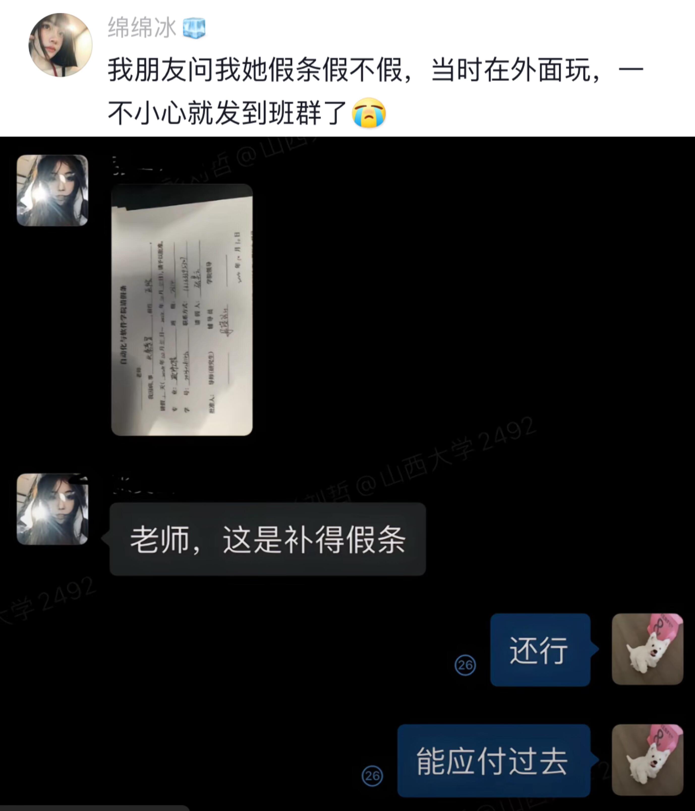我朋友问我她假条假不假,当时在外面玩,一不小心就发到班群了
