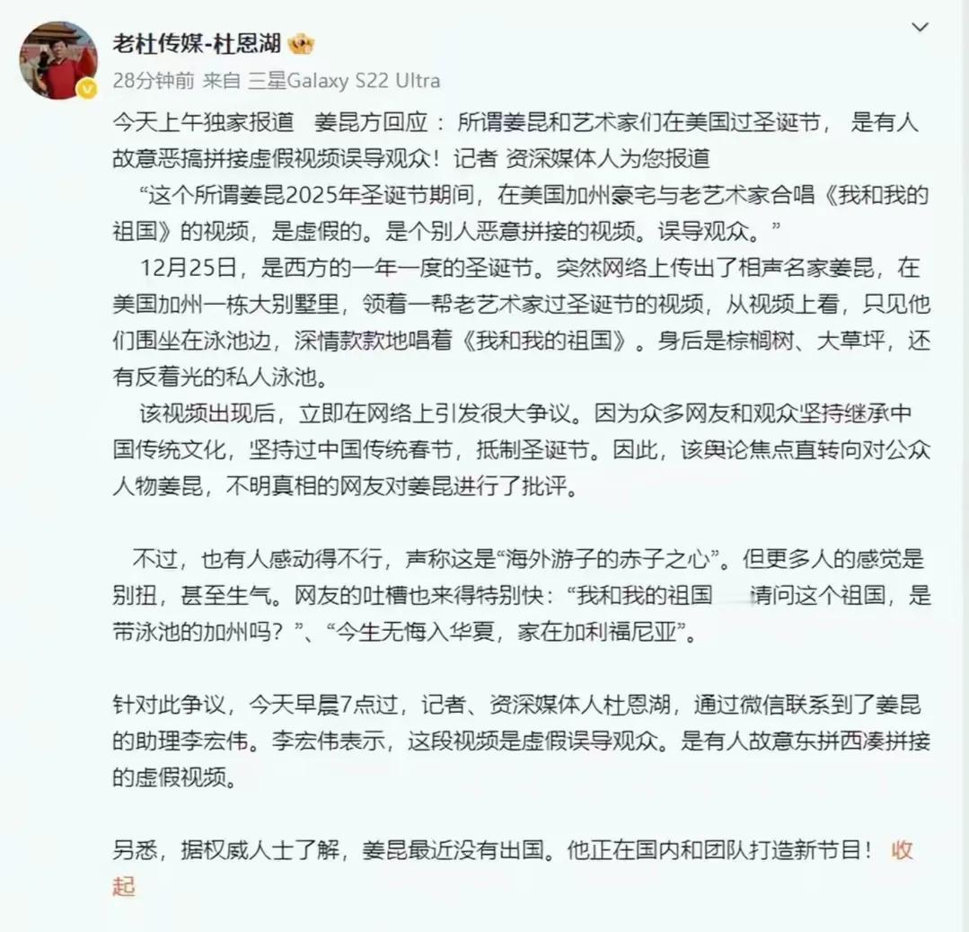 【原来是乌龙?】 有关加州深情歌唱的事件,当事人出来澄清,是嫁接拼接的东西,本人在国内录制节目。 如果事实真是这样,那还要给他们道歉,铺天盖地的讽刺挖苦是在虚伪的基础上。 是谁制造这起事件呢?又是出于何种目的?