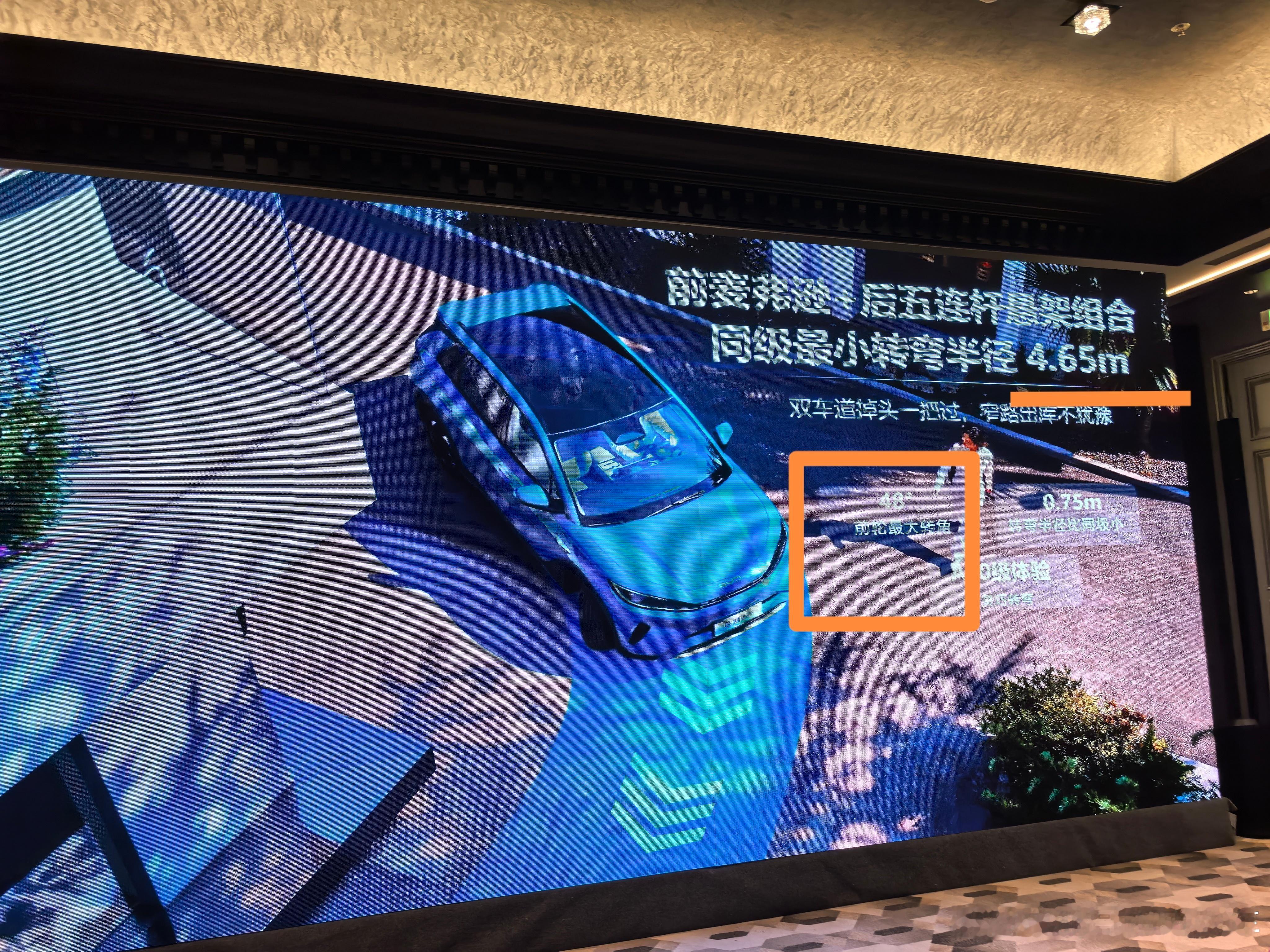 前轮最大转向角48度!比亚迪海狮05ev应该是前轮转向角最大的车型了!所以最小转弯半径4.65米。这个数值也很惊人。要知道海狮05ev 车长4520毫米,轴距2720毫米。这个尺寸的车型转弯半径能做到5米以内,不容易做到。我很想开这辆车体验一下,转弯半径是不是这么小。