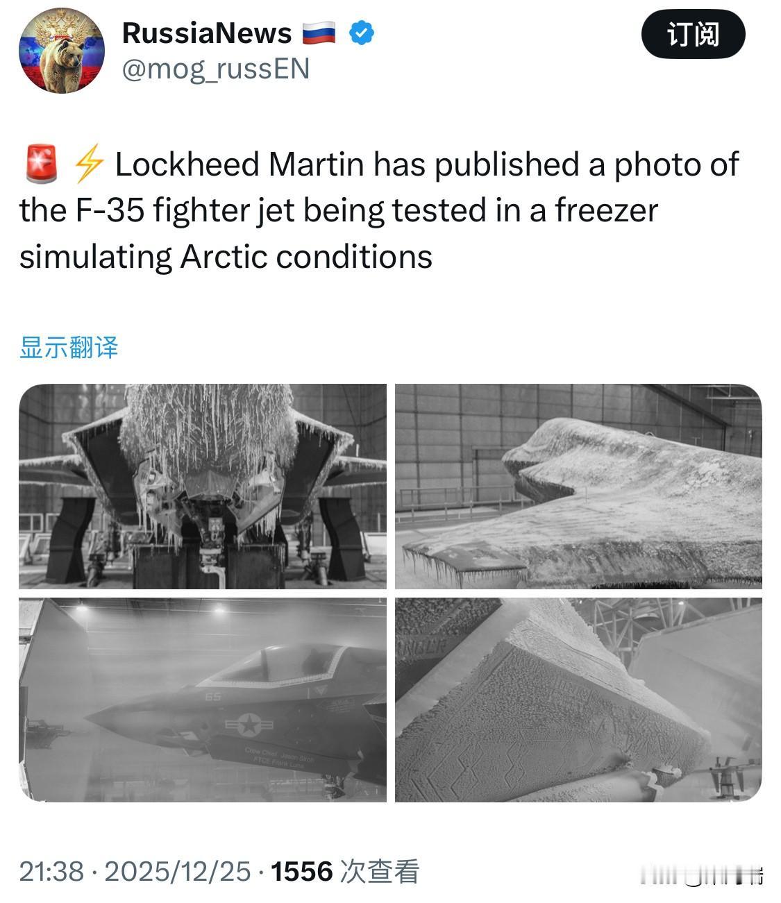 洛克希德·马丁公司公布了一张F-35战斗机在模拟北极条件的冷冻舱中进行测试的照片