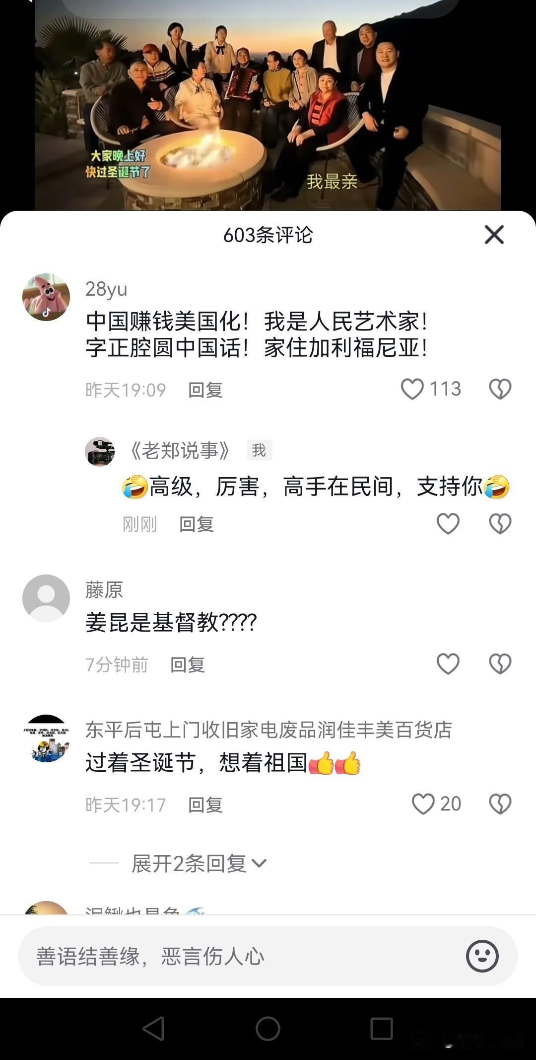 刚刚,在头条看到有网民发图称一群中国的老艺术家在美国过西方的圣诞节并唱爱国的红歌。引起我高度注意的不是所谓的老艺术家们,是下面的留言真有水平尤其是第一段留言打油诗也叫顺口溜,真有水平! 我想这位高人肯定是最好的诗人,真正爱国的诗人。记得抗日时期白求恩不远万里来到了中国,他们不远万里去了美国……其实去老美真没引起我的注意,我注意的就是打油诗,我也不想写更多的文字,但是文字字数不够微头条不算原创,所以我故意凑数哈哈哈哈嘎嘎嘎