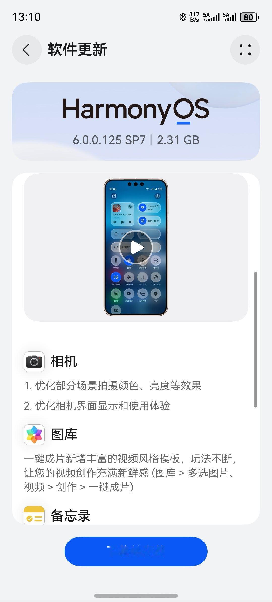 每日更之,这会是Mate 80 Pro。125版本,2.31G得包,真不小。虽然新增的点看起来好像不多,但每次鸿蒙的更新包还真是不小。里层的很多细节都做了打磨吧更新日志也是图文视频并茂了。
