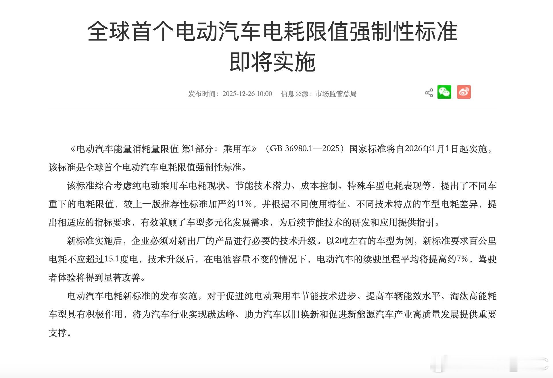 电动汽车电耗限值强制新规全球首个电车电耗强制标准发布 《电动汽车能量消耗量限值 第1部分:乘用车》(GB 36980.1—2025)国家标准将自2026年1月1日起实施,该标准是全球首个电动汽车电耗限值强制性标准。新标准实施后,企业必须对新出厂的产品进行必要的技术升级。以2吨左右的车型为例,新标准要求百公里电耗不应超过15.1度电,技术升级后,在电池容量不变的情况下,电动汽车的续驶里程平均将提高约7%。对于消费者的好处就是,电耗下降直接减少使用成本,国家强制把关,避免买到 “电老虎” 车型。