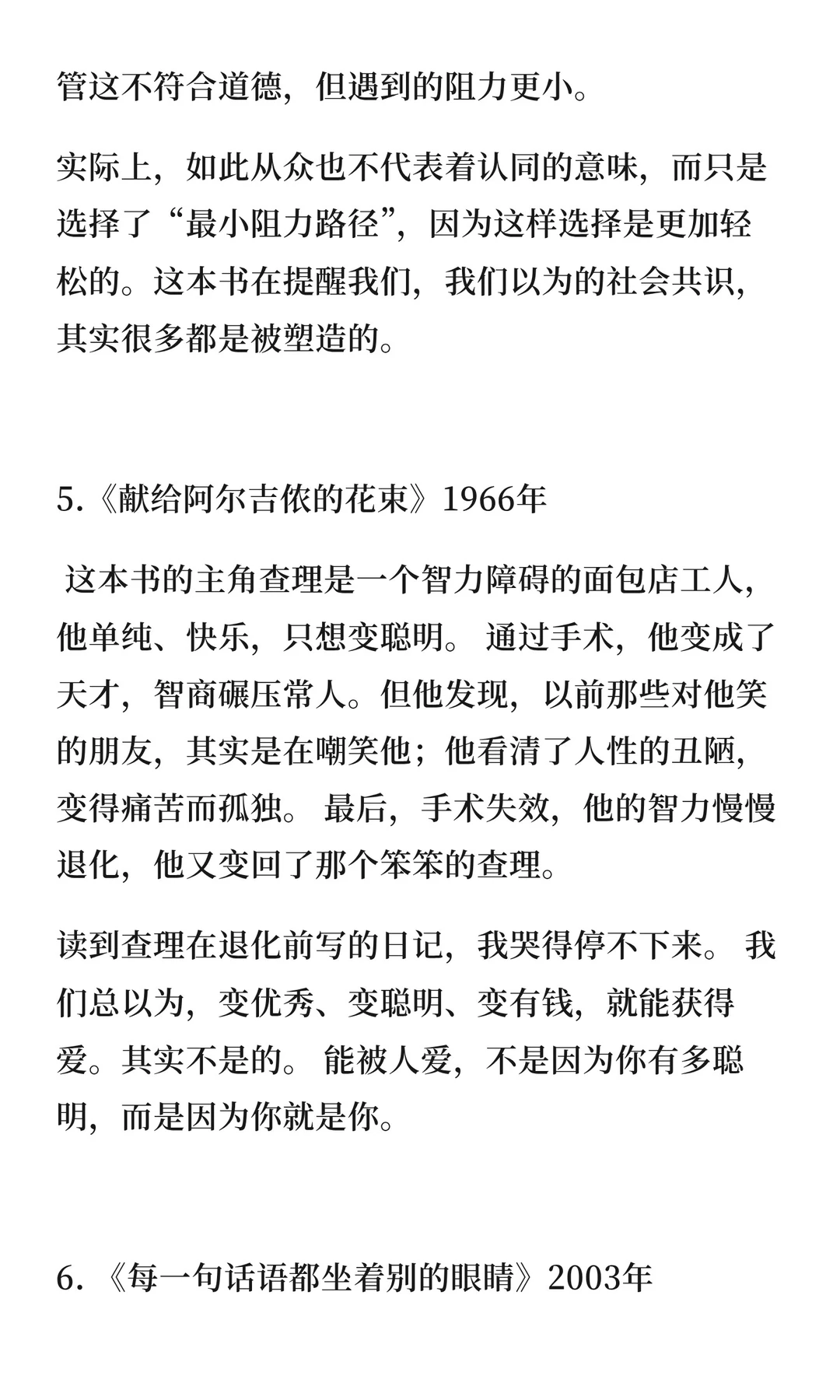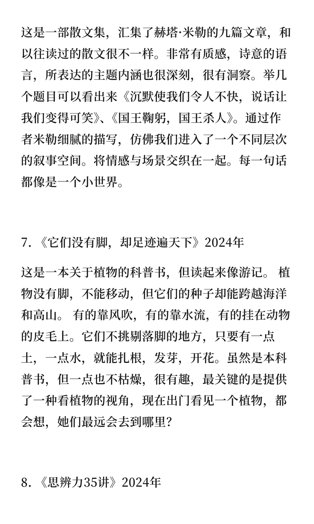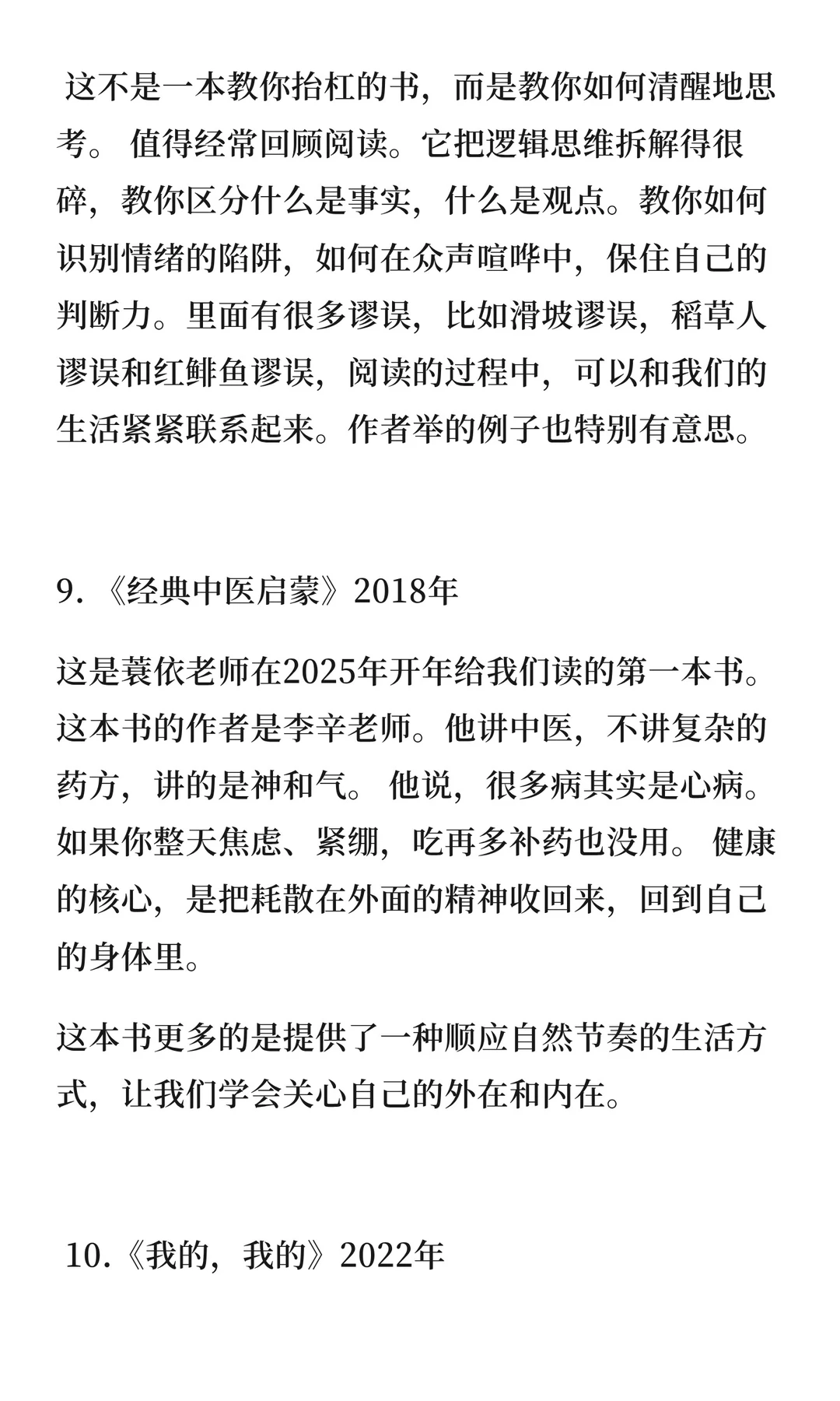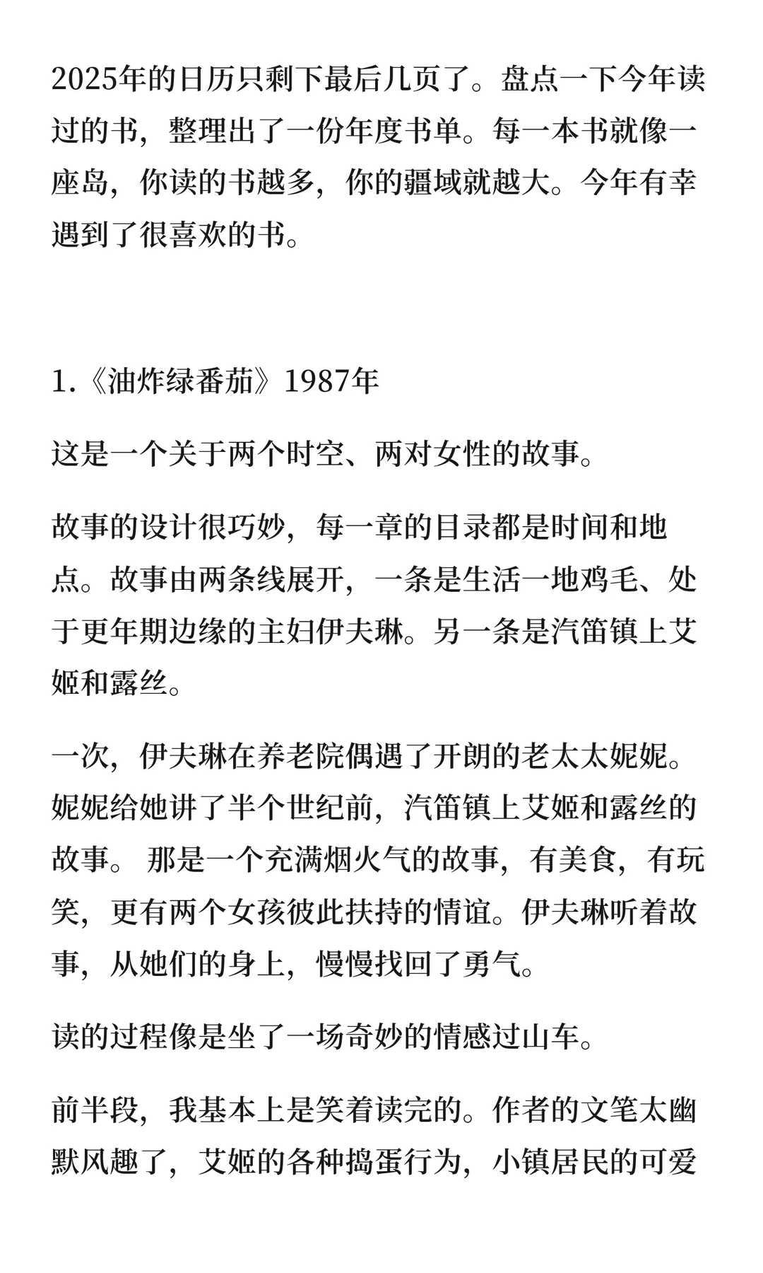 昨天晚上复盘了2025年读过的书,合计有100多本,其中很多是短篇的儿童文学作品,很快就能看完的那种。 挑选了10本最爱的书,也是年度书单top 10。 1⃣《油炸绿番茄》 2⃣《昨日的世界》 3⃣《沧浪之水》 4⃣《见树又见林》 5⃣《送给阿尔吉侬的花束》 6⃣《每一句话语都坐着别的眼睛》 7⃣《它们没有脚,却足迹遍天下》 8⃣《思辩力35讲》 9⃣《经典中医启蒙》 🔟《我的,我的》 每本书都带来不同感悟。这些书也让我更深入思考生活、人性和社会,成为更清醒、有思考力的人。 具体内容见图片。