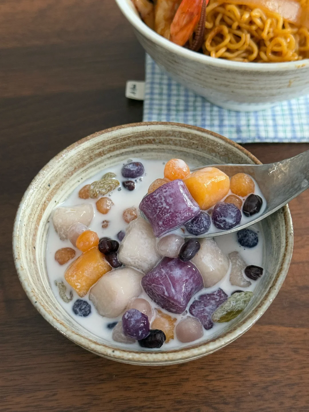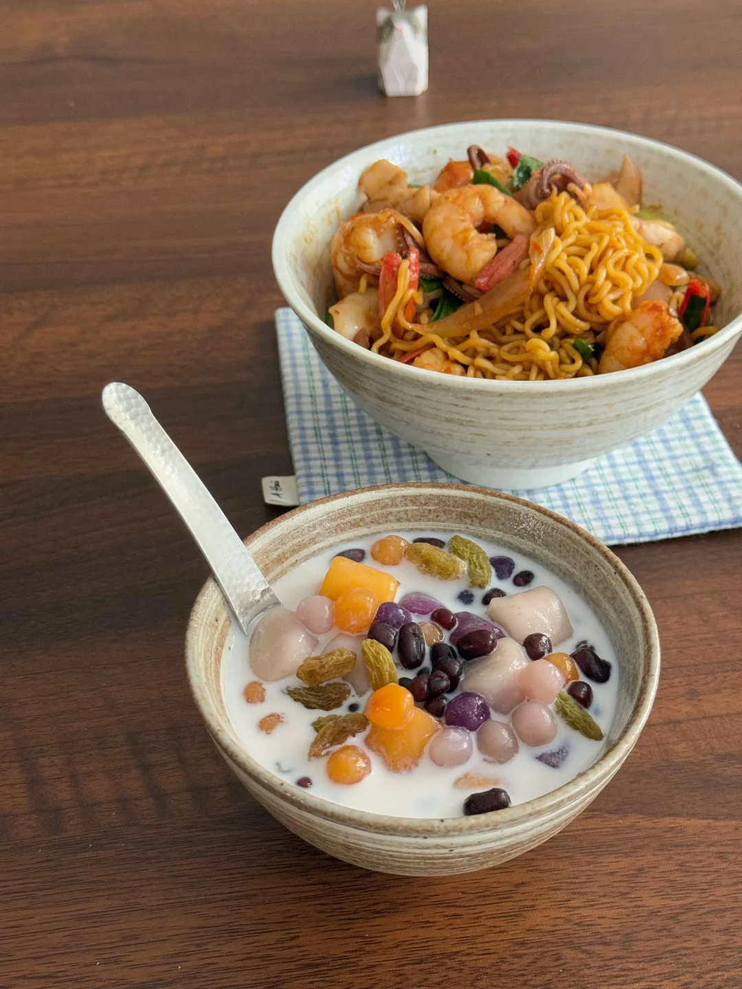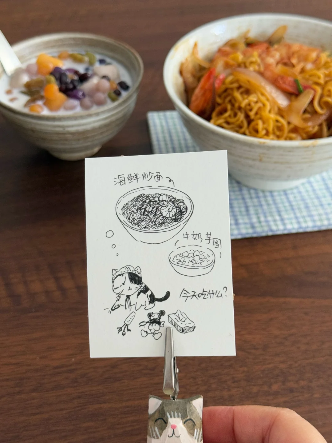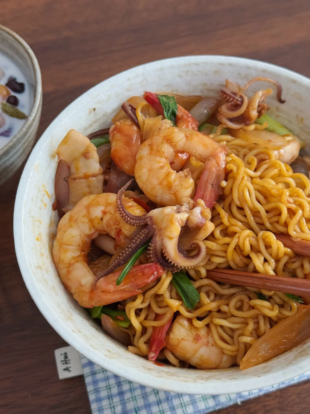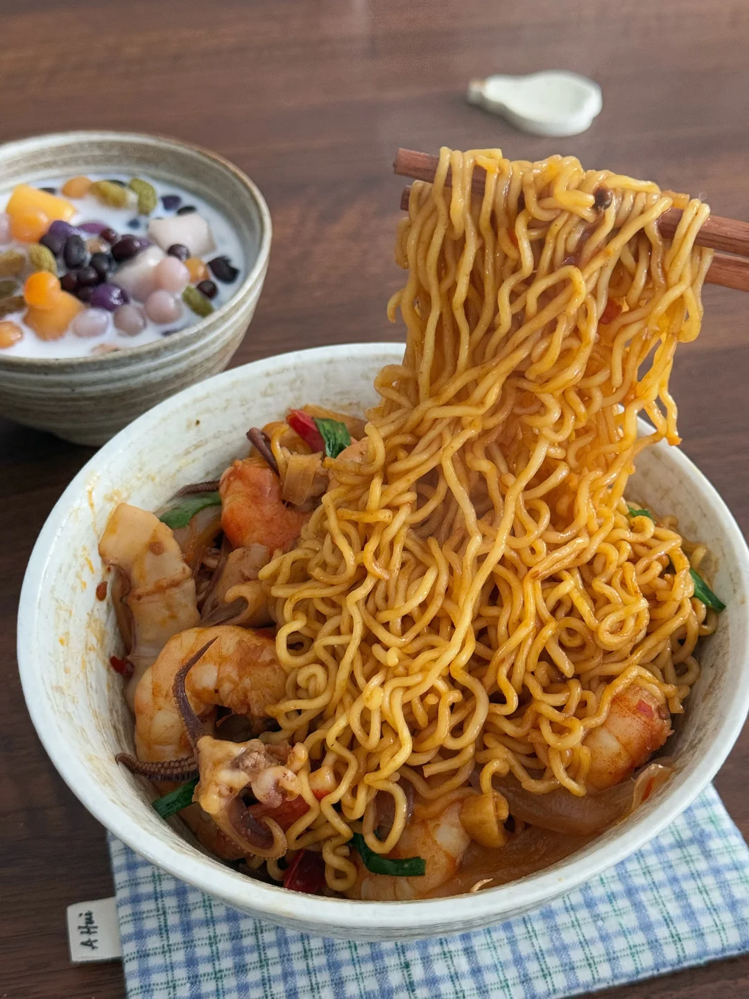 今日午餐:虾仁鱿鱼炒方便面,牛奶芋圆 🍜 喜欢鱿鱼和大虾,真的爱吃!有点视觉上的小遗憾——油放少了,拍出来少了点油亮亮的光泽,但香气一点没跑!下次多放一勺油肯定能封神~ 大芋圆、小芋圆、葡萄干、蜜红豆,加蜂蜜和牛奶,简单的甜品喝一喝! 专心吃掉一碗面,再舀起一勺晃悠悠的芋圆,日子很惬意! 爱你老己 一人食 懒人食谱 美食手帐 一个人吃什么 中式养胃计划 治愈系美食 美食手帐 萝卜纸巾猫 家常菜