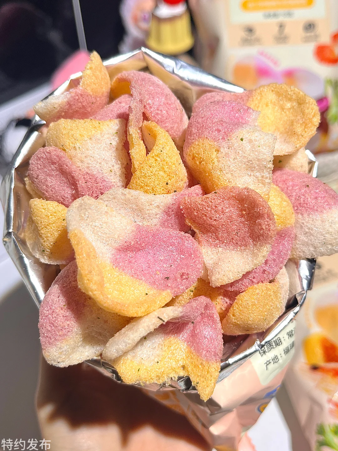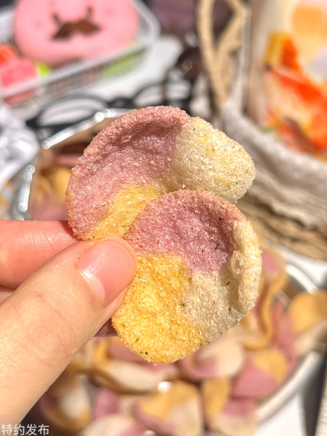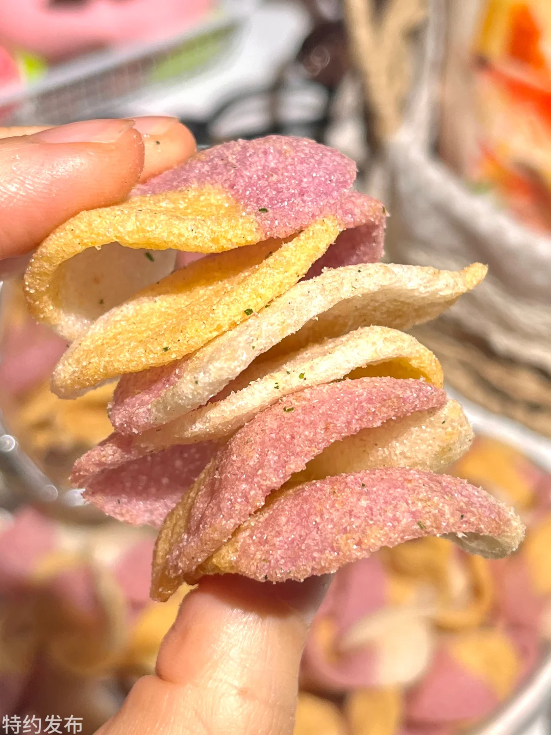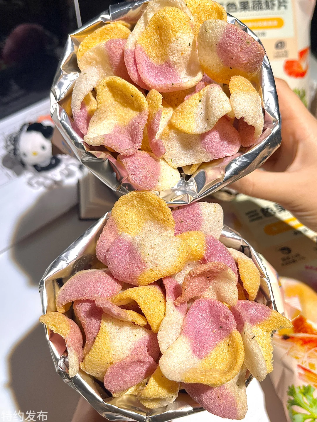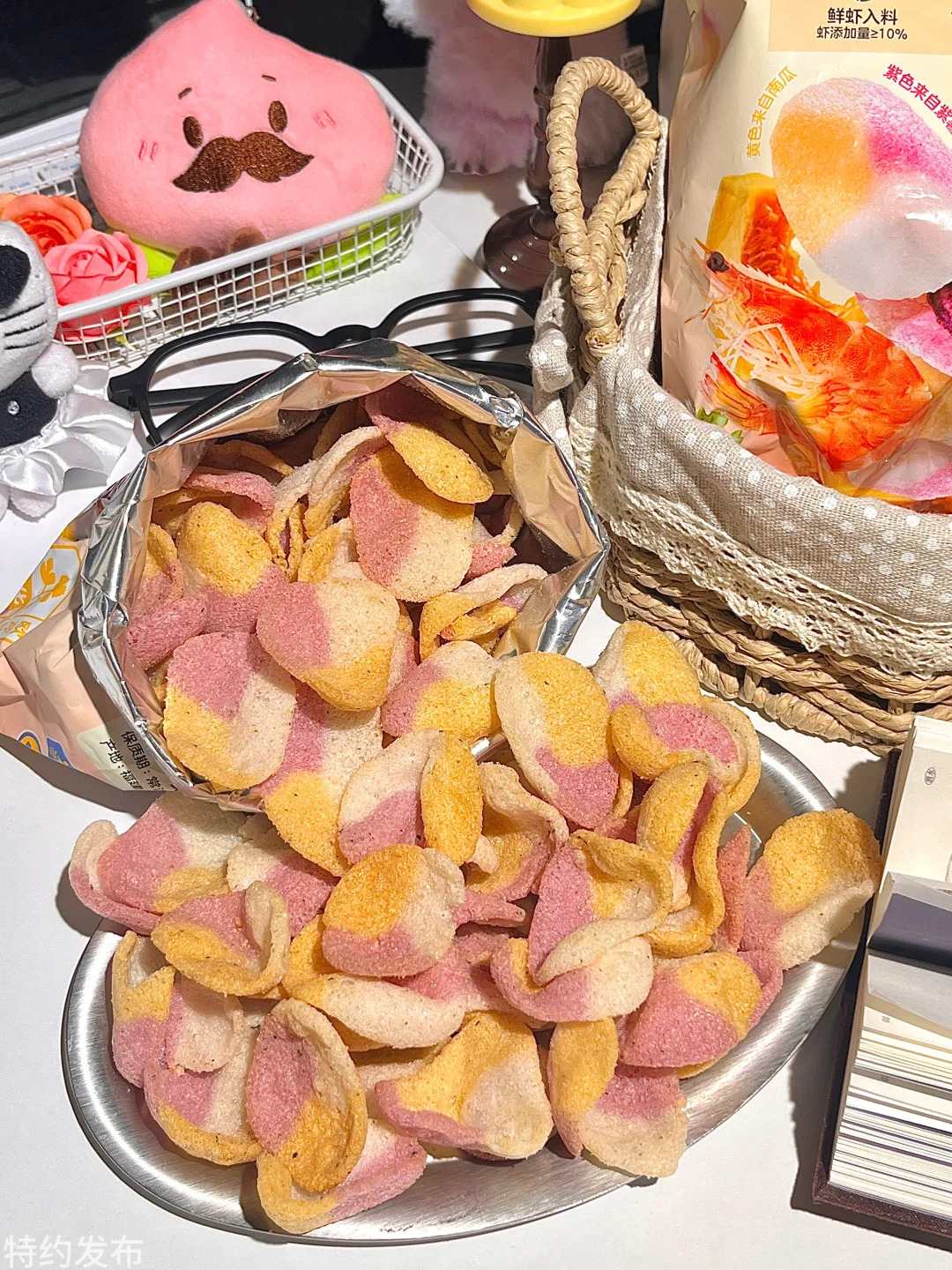 刚撕开袋就飘出鲜虾🦐的鲜气,混着紫薯和南瓜🎃的清甜,每片都是紫黄白三色渐变,看着就有食欲!