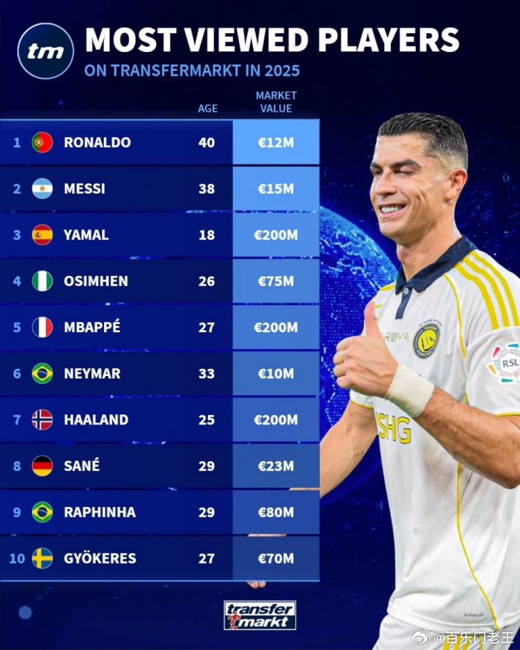 2025年德转球员信息浏览量排名:C罗居首,梅西、亚马尔二三位12月26日讯 德国转会市场统计了2025年球员信息页面的浏览量,并列出排名,C罗、梅西、亚马尔前三。2025年德转球员页面浏览量排名:C罗梅西亚马尔奥斯梅恩姆巴佩内马尔哈兰德萨内拉菲尼亚约克雷斯