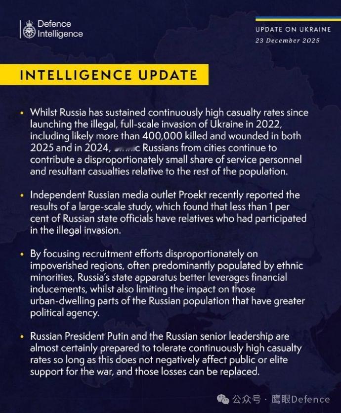 烽火问鼎计划 稍早些,乌军总司令西尔斯基宣称,俄军目前在前线的兵力超过71万人,这个数据与普京在12月19日“年度盘点”中公布的数据基本一致,当时普京说目前有超过70万俄军驻扎在乌克兰境内,请朋友们一定要注意这两个基本一致、同时来自俄乌双方高层的数字,我后面还要提到。西尔斯基同时提到了俄军的伤亡,称俄军每天要平均损失1000人到1100人,“其中大部分都死了”,乌克兰的战略是尽可能消耗俄军兵力并阻止其推进,“守住我们的领土,同时打击敌人的近后方、作战纵深以及深入俄罗斯境内,以削弱其防御能力和工业潜力。”负责波克罗夫斯克方向作战的乌军第7快速反应军司令拉西丘克准将宣称,从今年9月1日至今,俄军在波克罗夫斯克方向已经丢下了超过8000具尸体,而且还在不断增加。《世界报》则援引英国国防部情报部门的信息报道称,自2024年至今,俄军在乌克兰损失了超过40万人,包括阵亡和受伤。