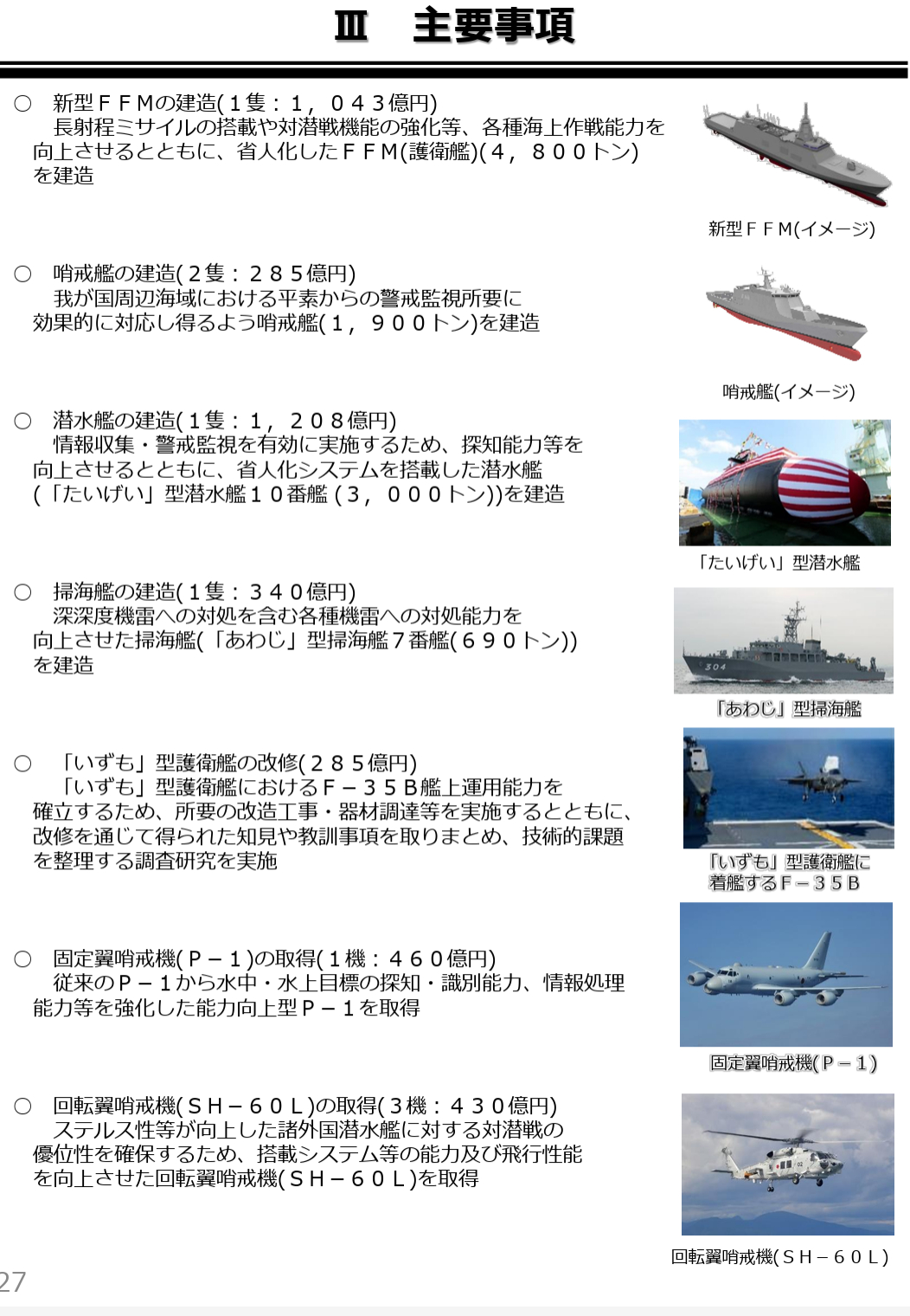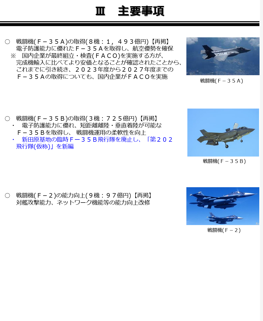 跟概算请求案相比,令和8年度防卫预算陆海空常规装备预算9929亿(砍了110亿)——MPMS改:11套,242亿(砍了6亿)——24MMCV:8辆,95亿(不变)——25RCV:18辆,276亿(砍了3亿)——10TK:8辆,158亿(砍了2亿)——AMV人员运输型:23辆,171亿(加了1亿)——20式步枪:56亿(砍了1亿)——新型FFM:1艘,1043亿(砍了5亿)——樱级OPV:2艘,285亿(砍了2亿)——大鲸级SS:1艘,1208亿(加了9亿!)——淡路级MSO:1艘,340亿(砍了2亿)——出云级DDH改修:285亿(砍了2亿)——P-1:1架,460亿(砍了13亿)——SH-60L:3架,430亿(砍了19亿)——F-35A:8架,1493亿(砍了32亿)——F-35B:3架,725亿(砍了5亿)——F-2能力向上改修:9架,97亿(砍了36亿)