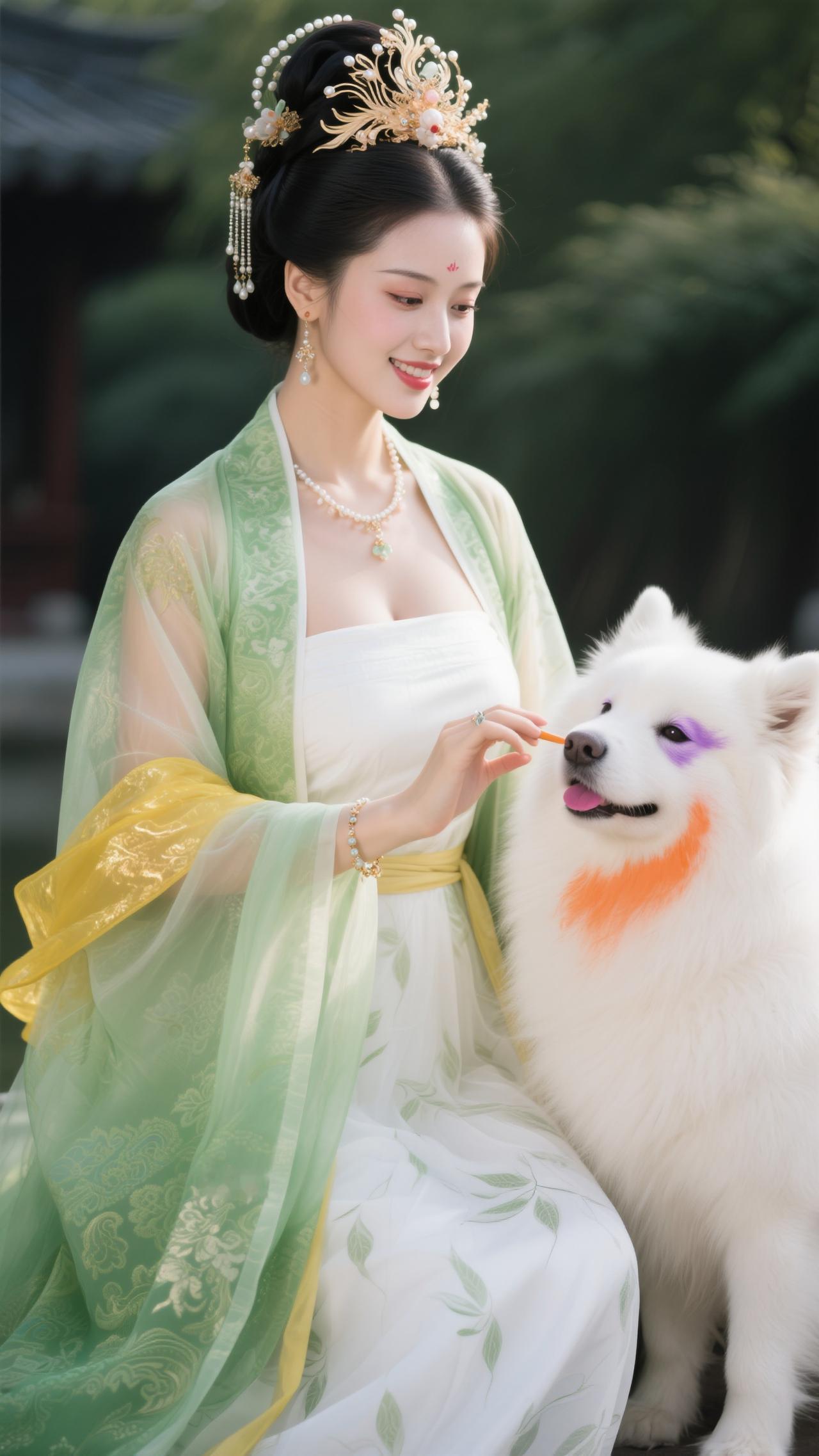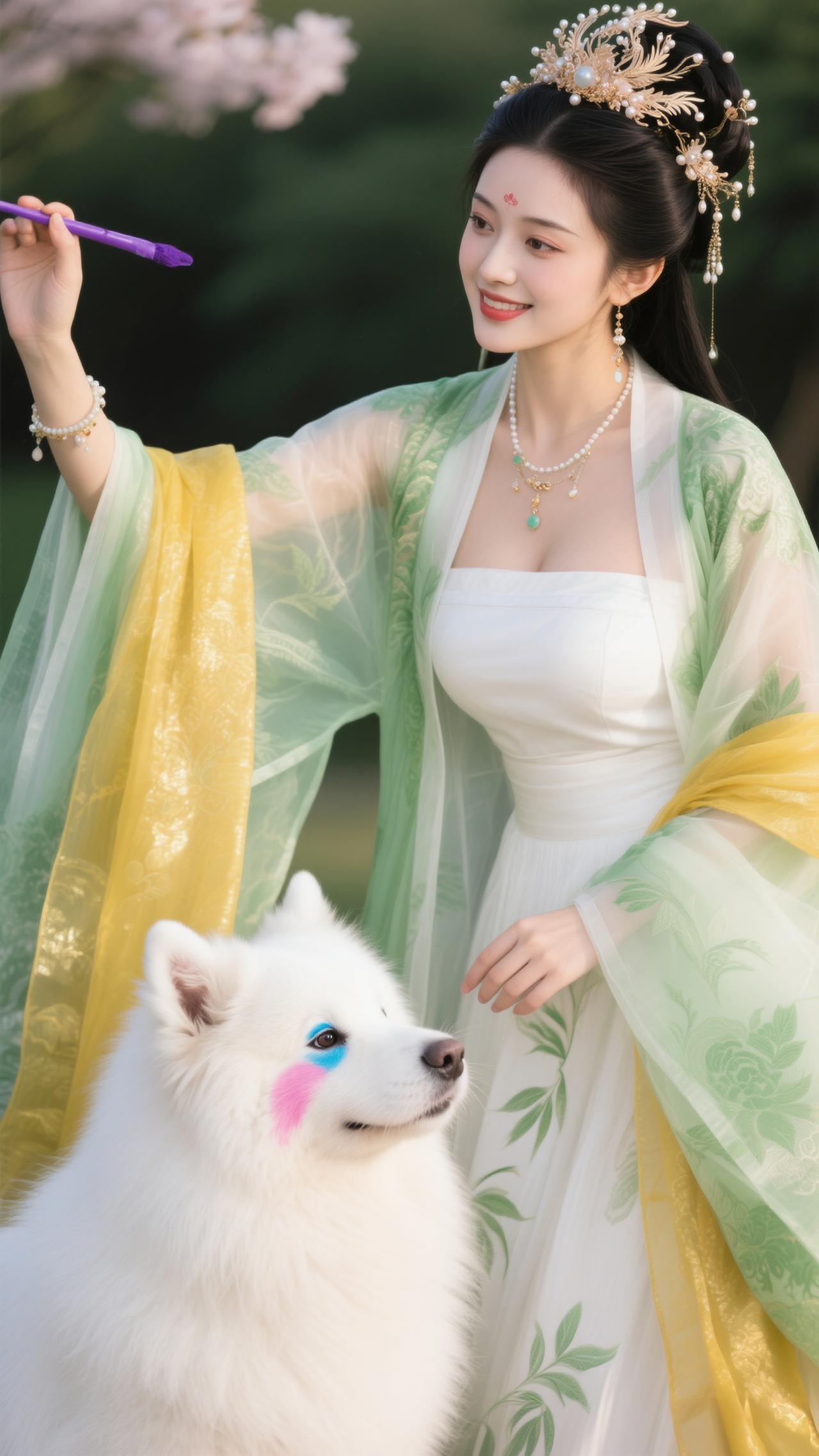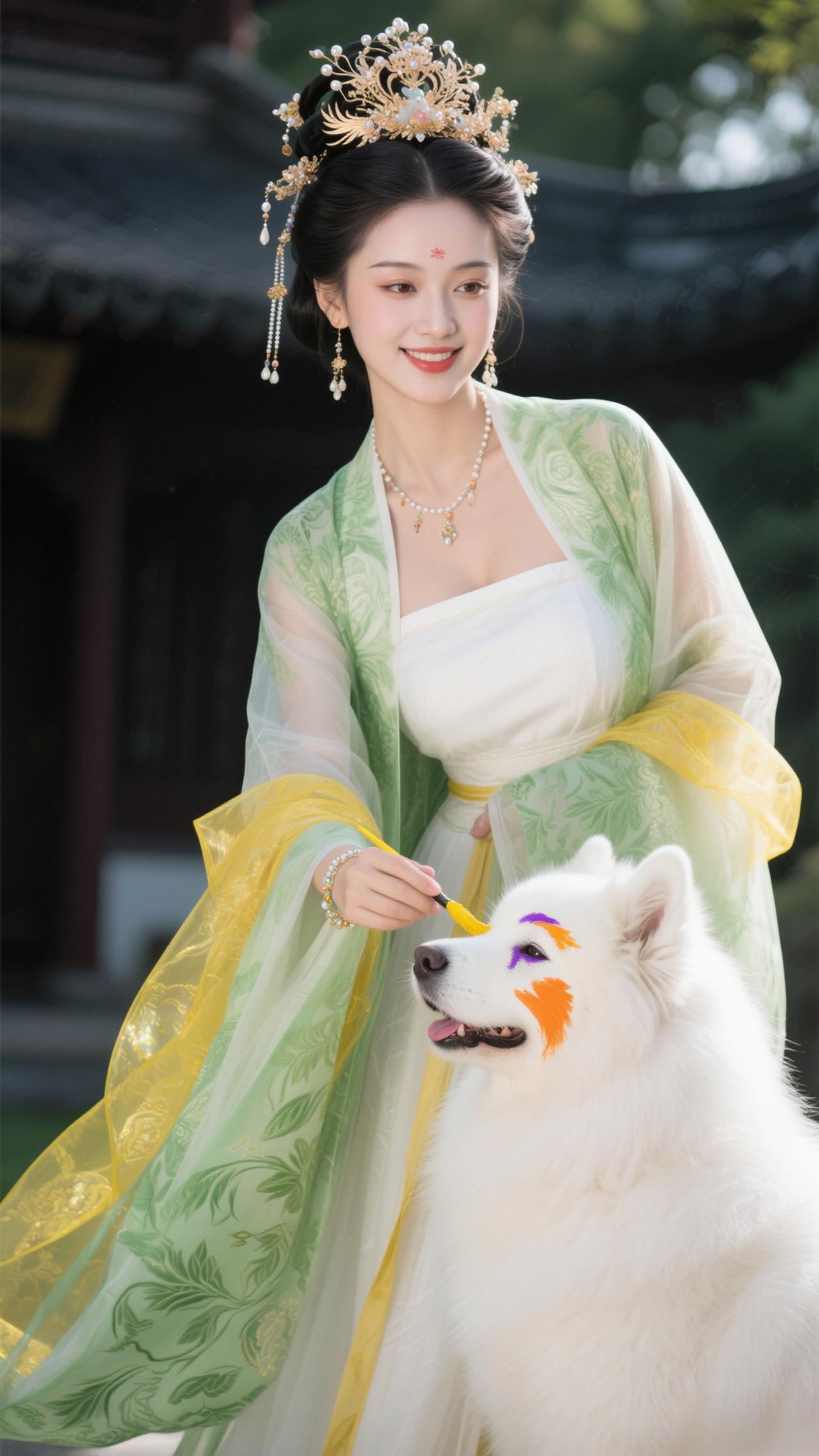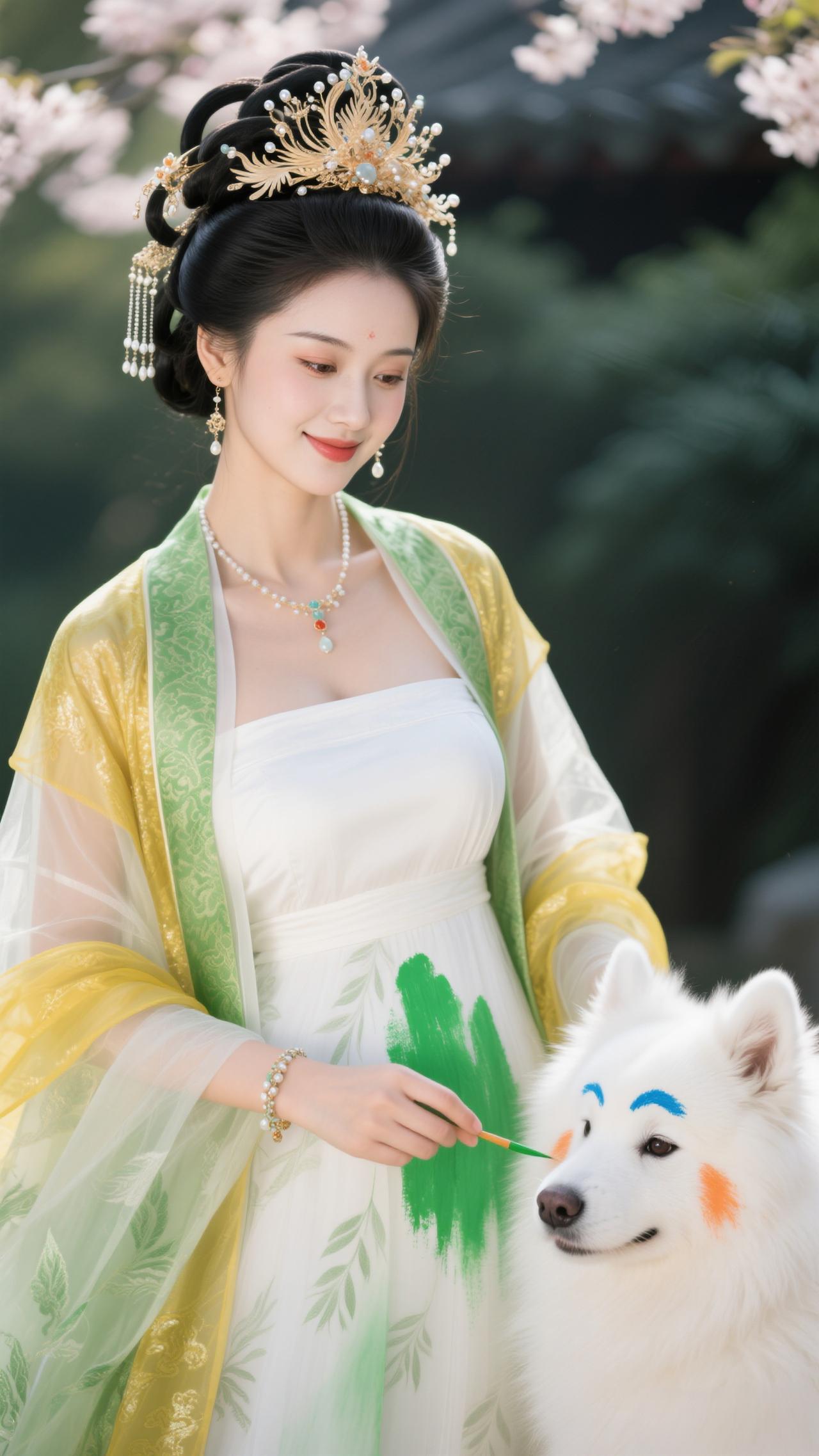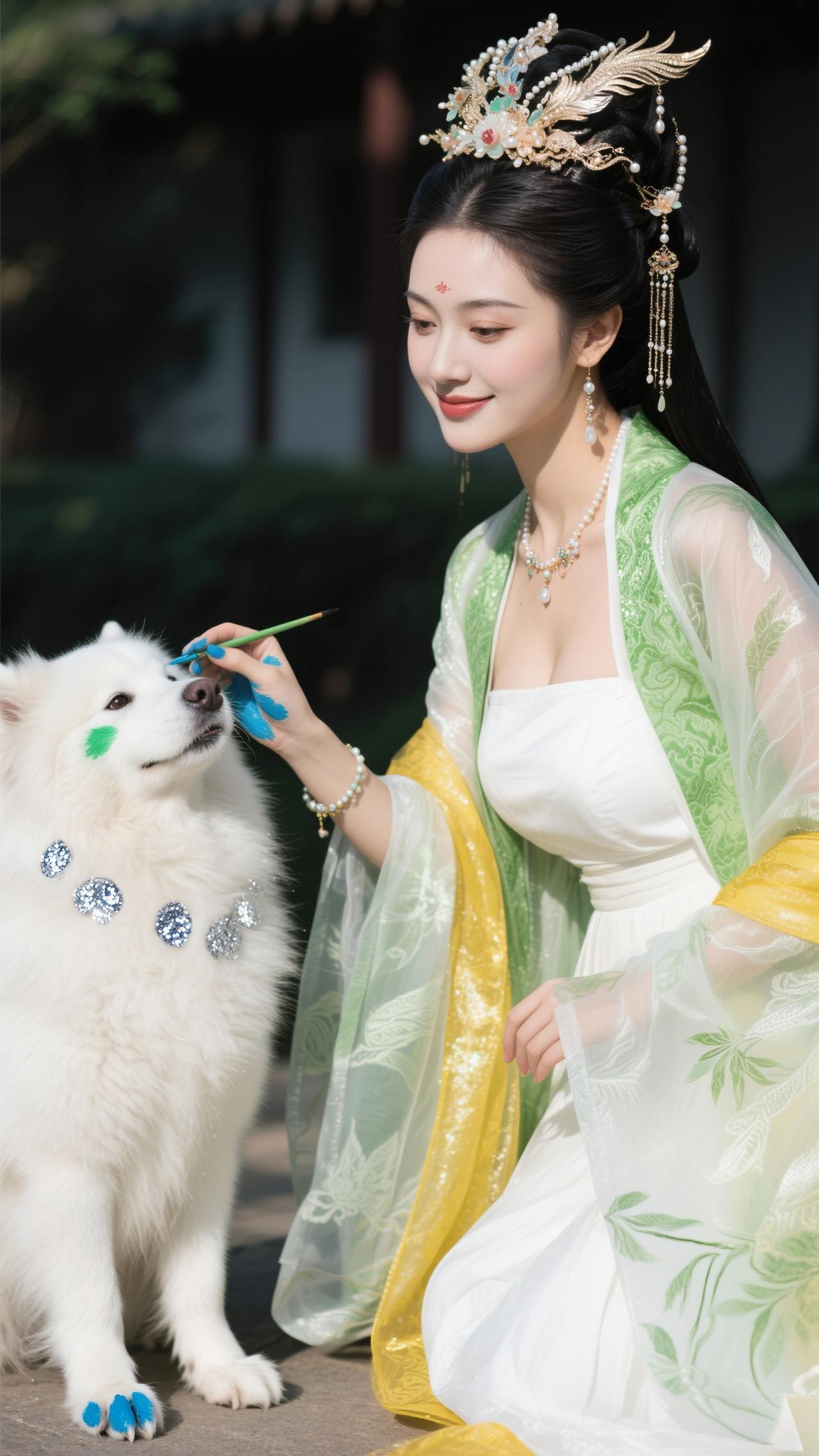 《采桑子·芳阶戏犬》 绿衫黄带临风舞,金钿凝光。 笑绘毛郎,点染霜毫惹犬忙。 阶前花气熏衣软,风拂丝扬。 一晌疏狂,共伴仙萌醉暖阳。