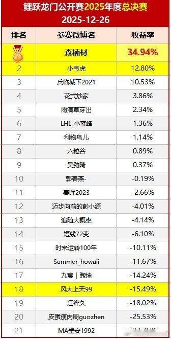 年度总决赛,是老鸭所看的第5期比赛。真诚祝贺前三名选手,尤其是冠军选手!本期比赛分化悬殊,像极了年度个股行情。2025年,只剩下3个交易日了。元旦假期有空,尽量写一写对2026年的若干个人观点。