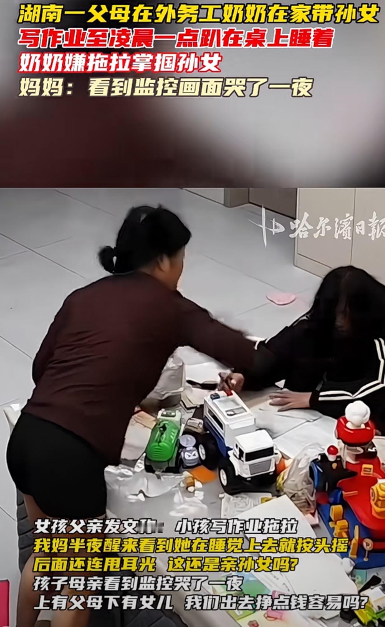 我只想说自己不带孩子就不要嫌弃这嫌弃那,还有脸发出来,出门打工挣钱就是理由了?你父母不都是自己带的吗? 父亲的意思奶奶半夜睡醒了打还在熬夜写作业孙女,感觉不可思议,女孩都这么辛苦了,从监控来看确实是这样,但是没辅导过作业的人谁知道奶奶为什么生气?有同感的很多吧! 谁辅导这熊孩子写作业谁也得崩溃,啥写作业用写到晚上一点儿!当妈的守着也会被气疯!除非一家人全摆烂! 湖南一父母在外务工奶奶在家带孙女,写作业至凌晨一点趴在桌上睡着,奶奶嫌拖拉掌掴孙女,妈妈:看到监控画面哭了一夜 !