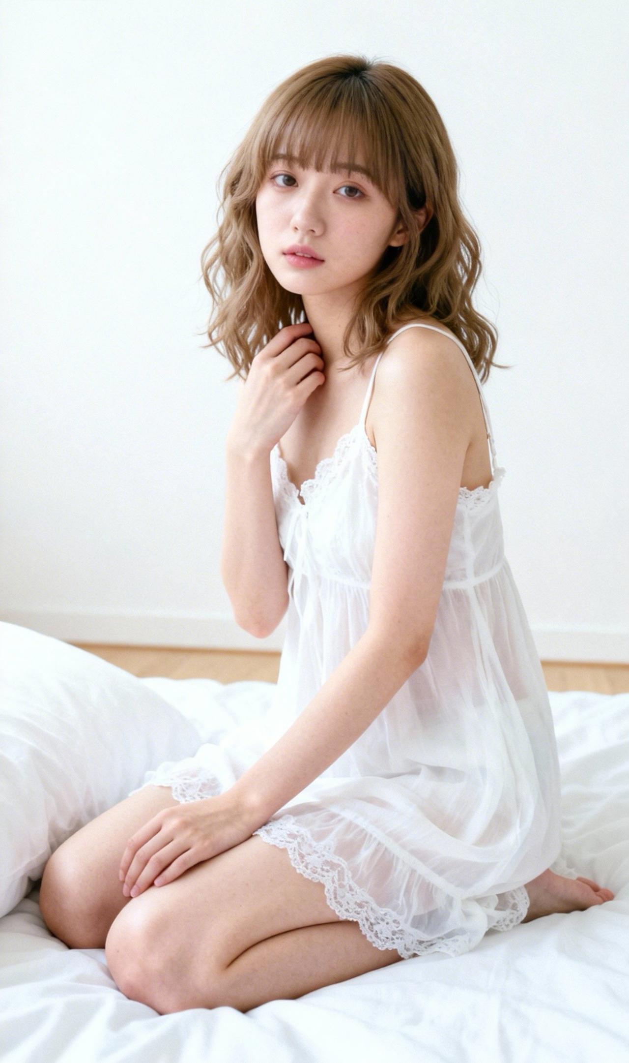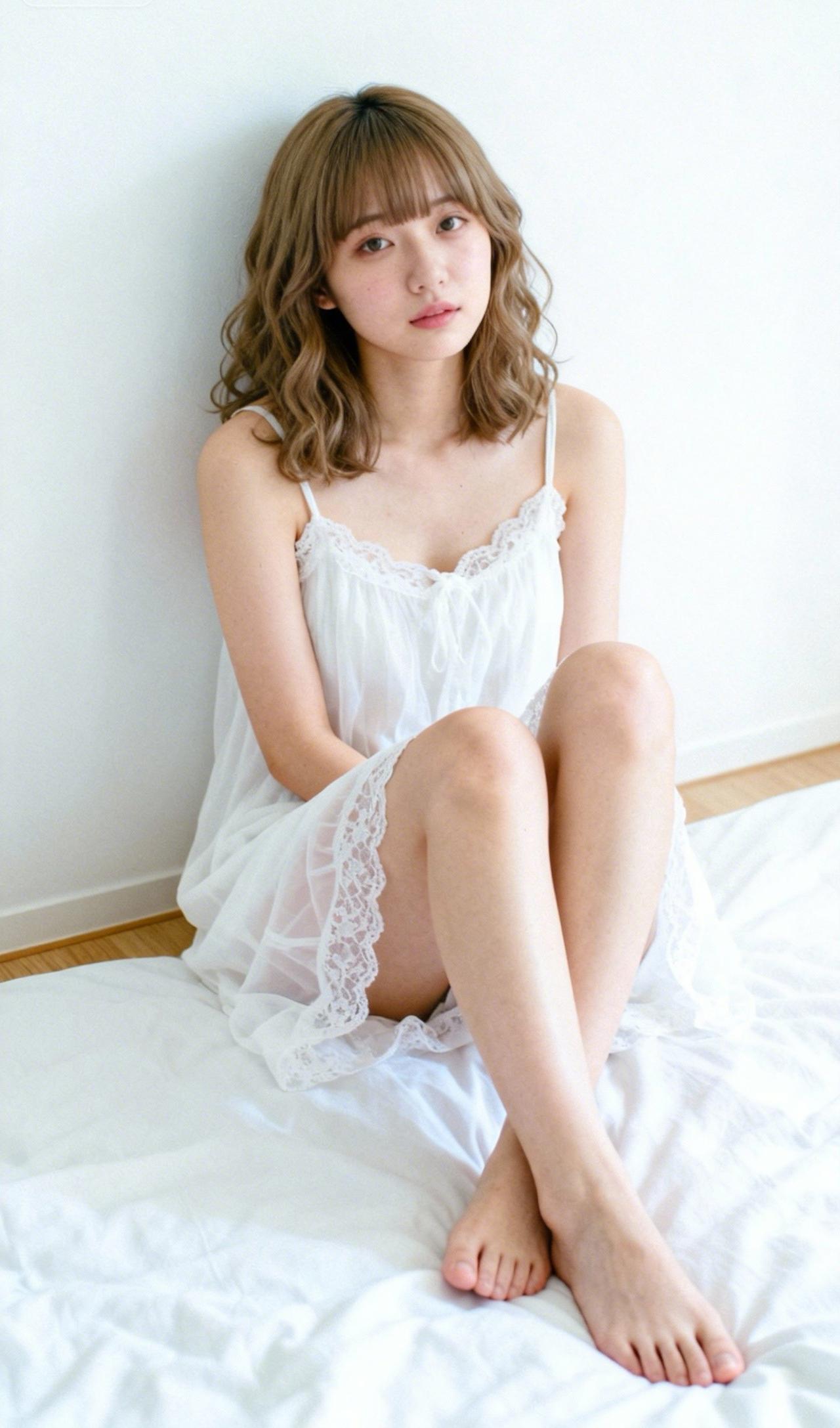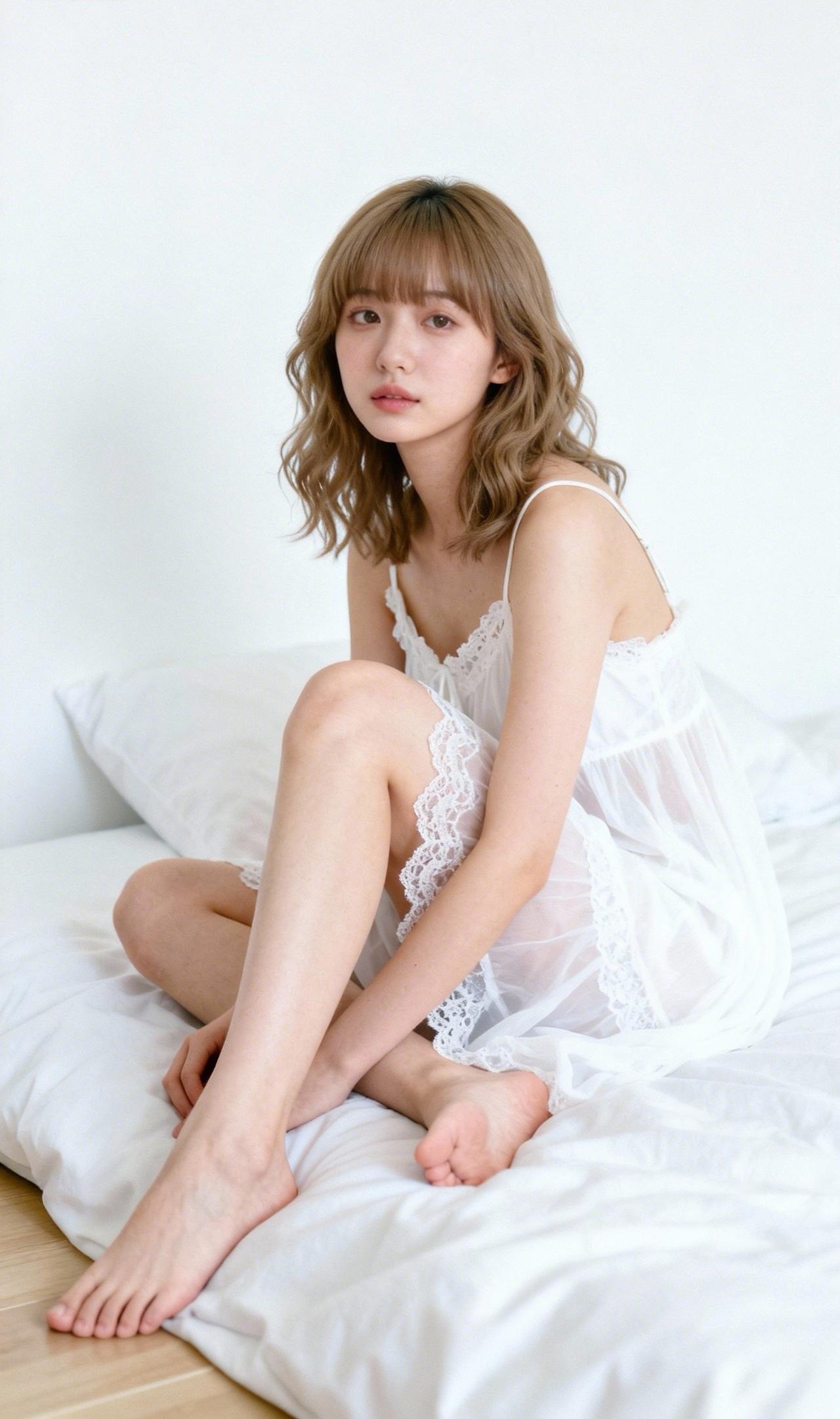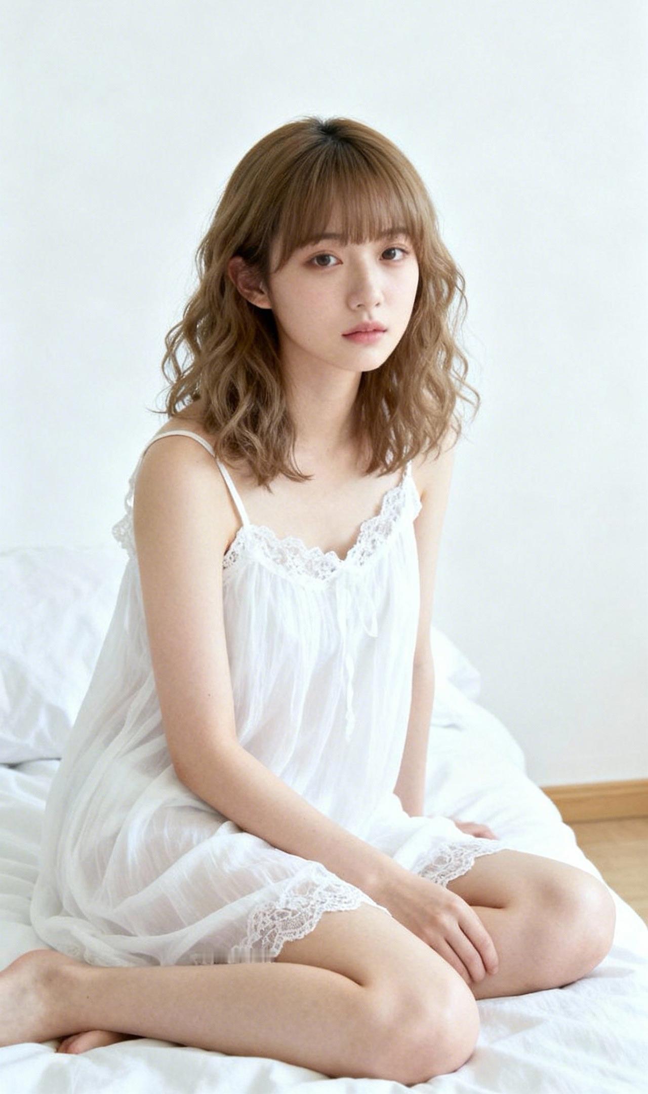 一个温柔的少女,坐在白色床上发呆。甜美女孩。长腿美女