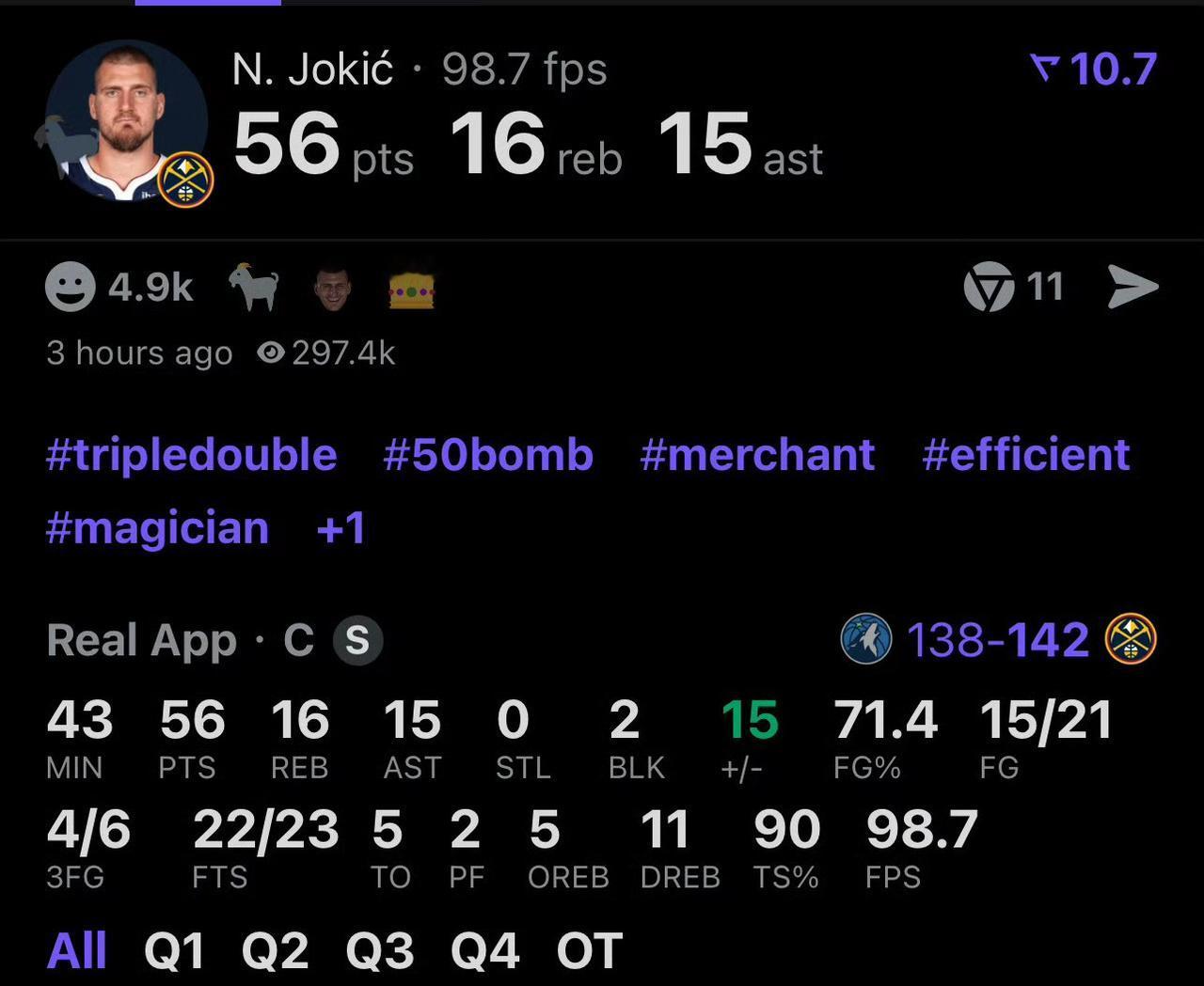 今天的圣诞大战,约基奇全场出战42分钟,21投15中,三分球6中4,罚球23中22,狂砍56分16篮板15助攻2盖帽。 1、56分刷新了约基奇赛季得分新高,也是圣诞大战历史第3高分,仅次于伯纳德-金(60分)和张伯伦(59分)。 2、NBA历史第二位单场砍下至少50分15篮板15助攻的球员。第一位是哈登。 3、加时赛独得18分,创下历史单节加时赛最高得分纪录。