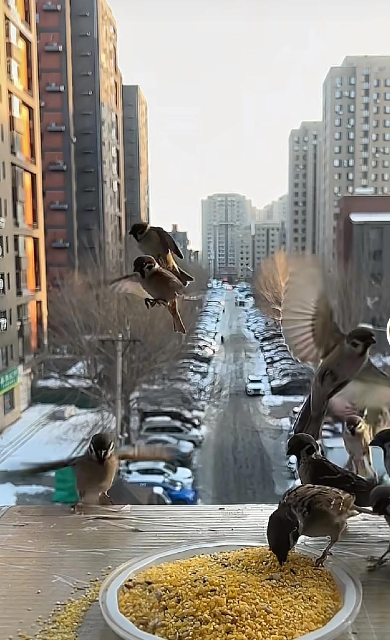 都说沈阳是一个有温度的城市 一位沈阳的朋友每天都会在窗台放上一碗小米,目的就是为了让小区附近的麻雀有食吃 结果小米刚放到窗台,就引来了很多麻雀,来这里吃东西 如果不是这位朋友的好心,这几只麻雀可能好久都会找不到吃的,饿肚子 感谢沈阳这位有爱心的朋友