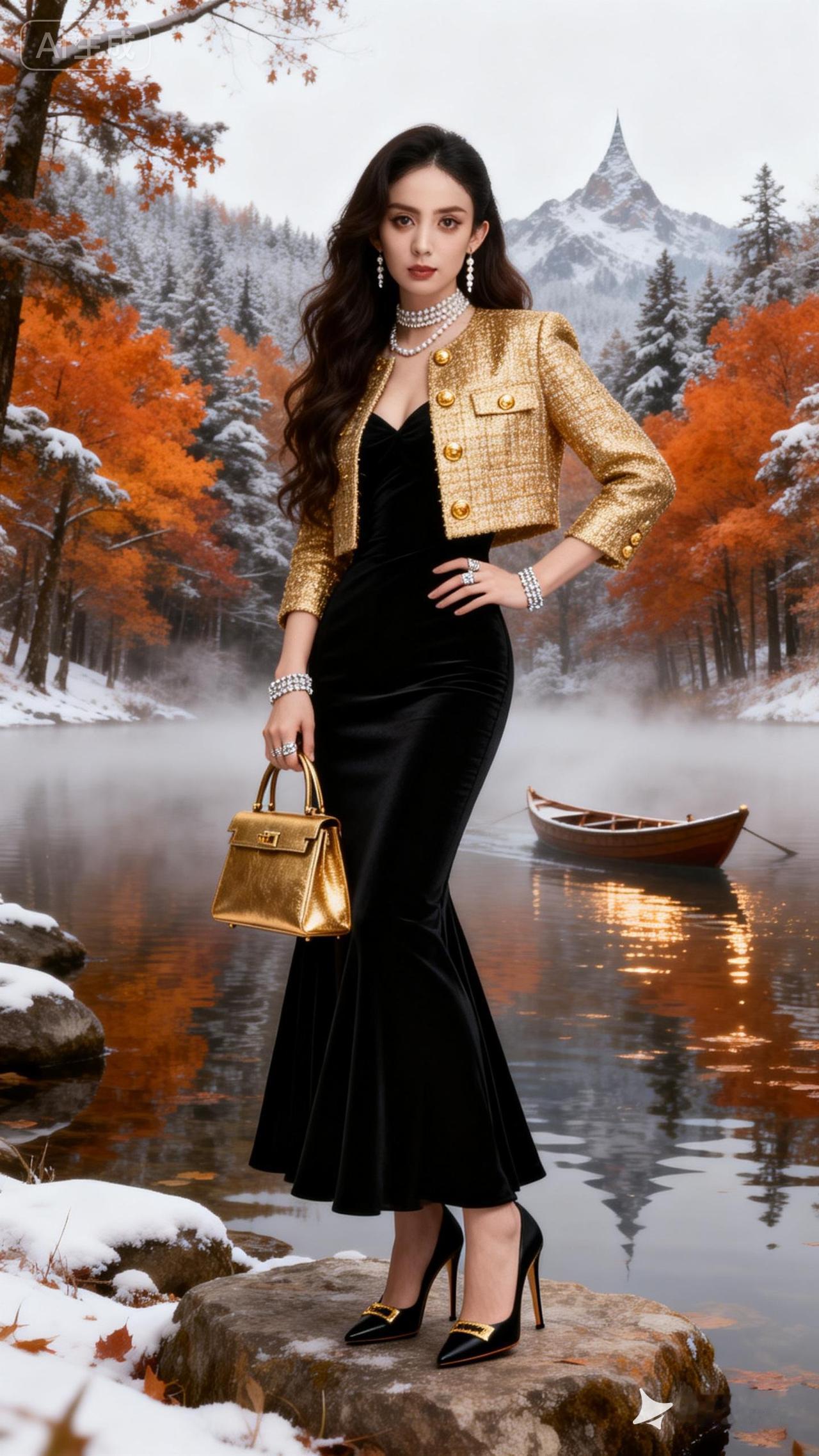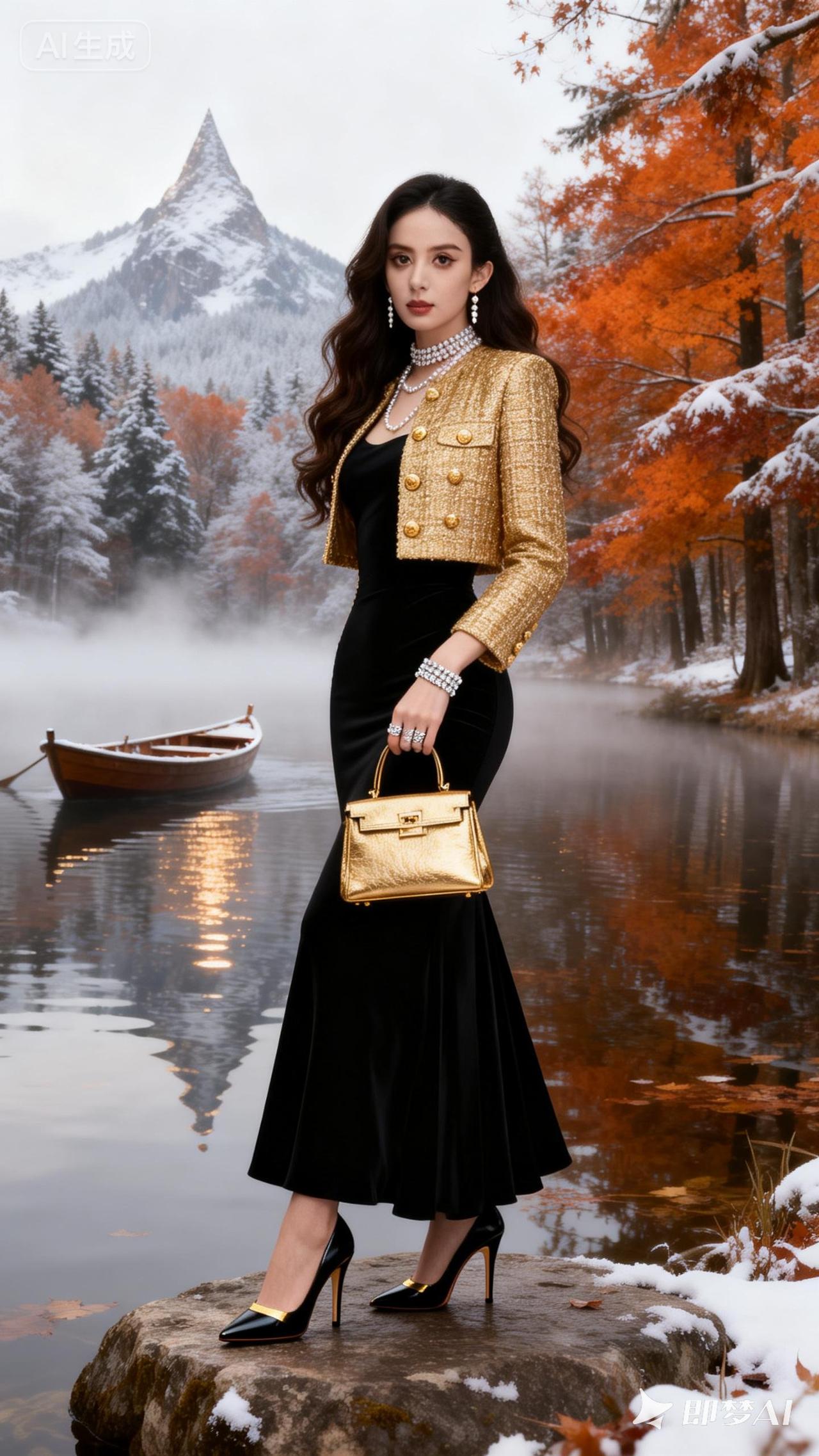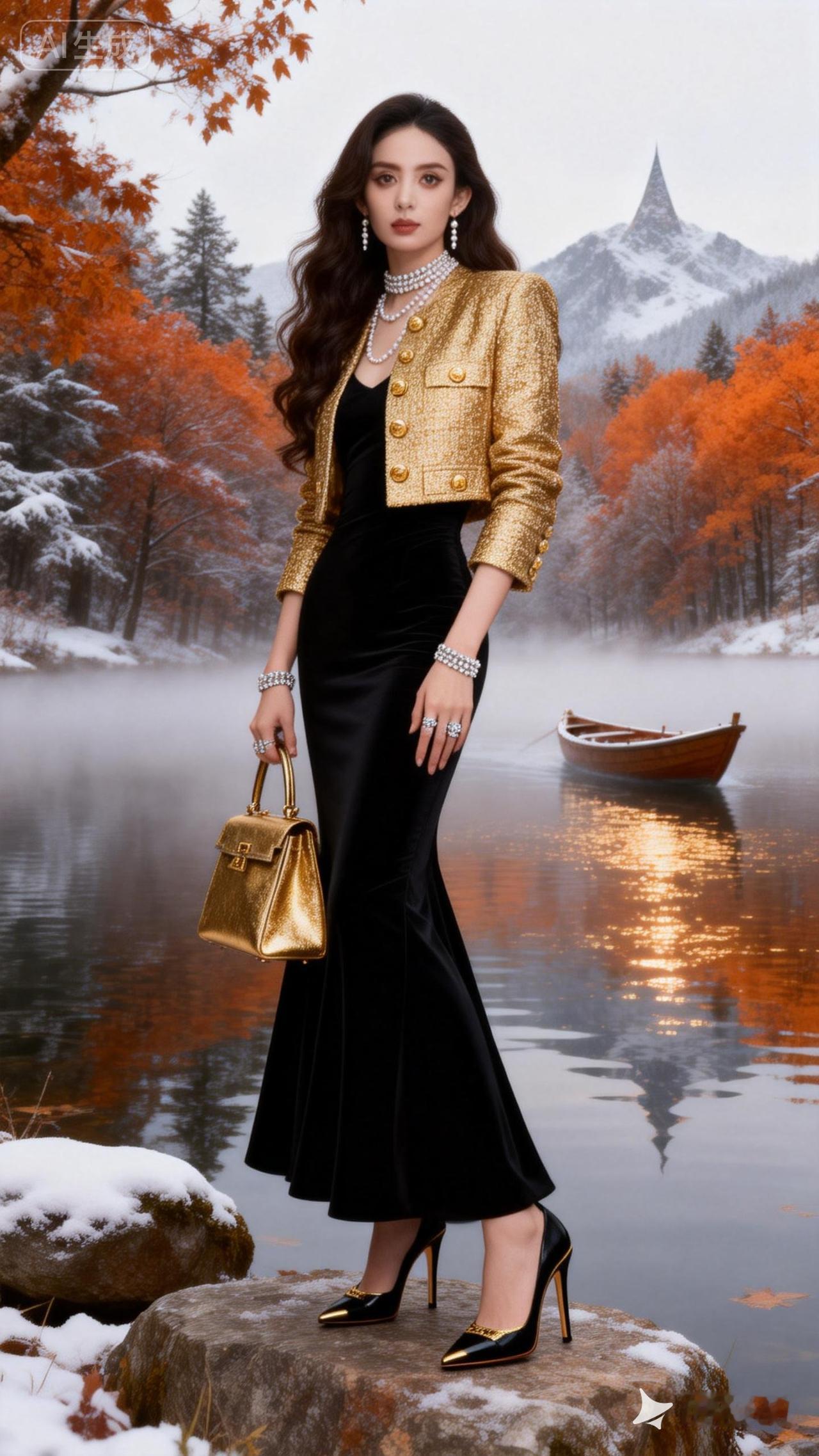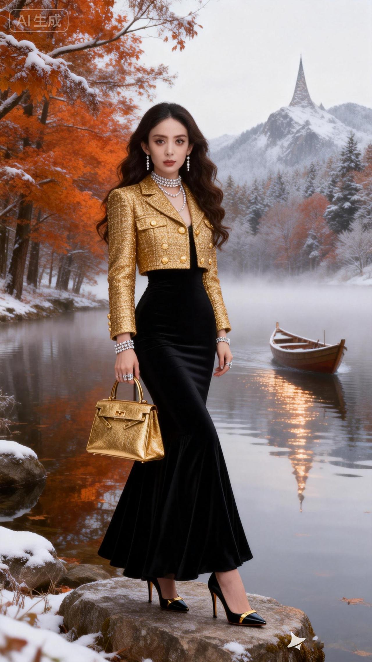 冬日雪景中的优雅穿搭,金色外套与黑色长裙的完美搭配,尽显时尚与魅力。