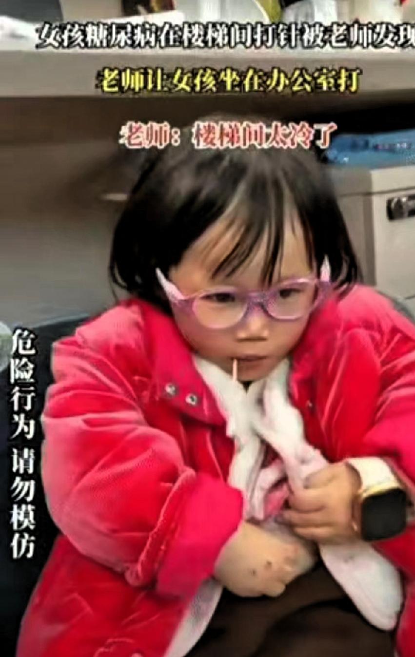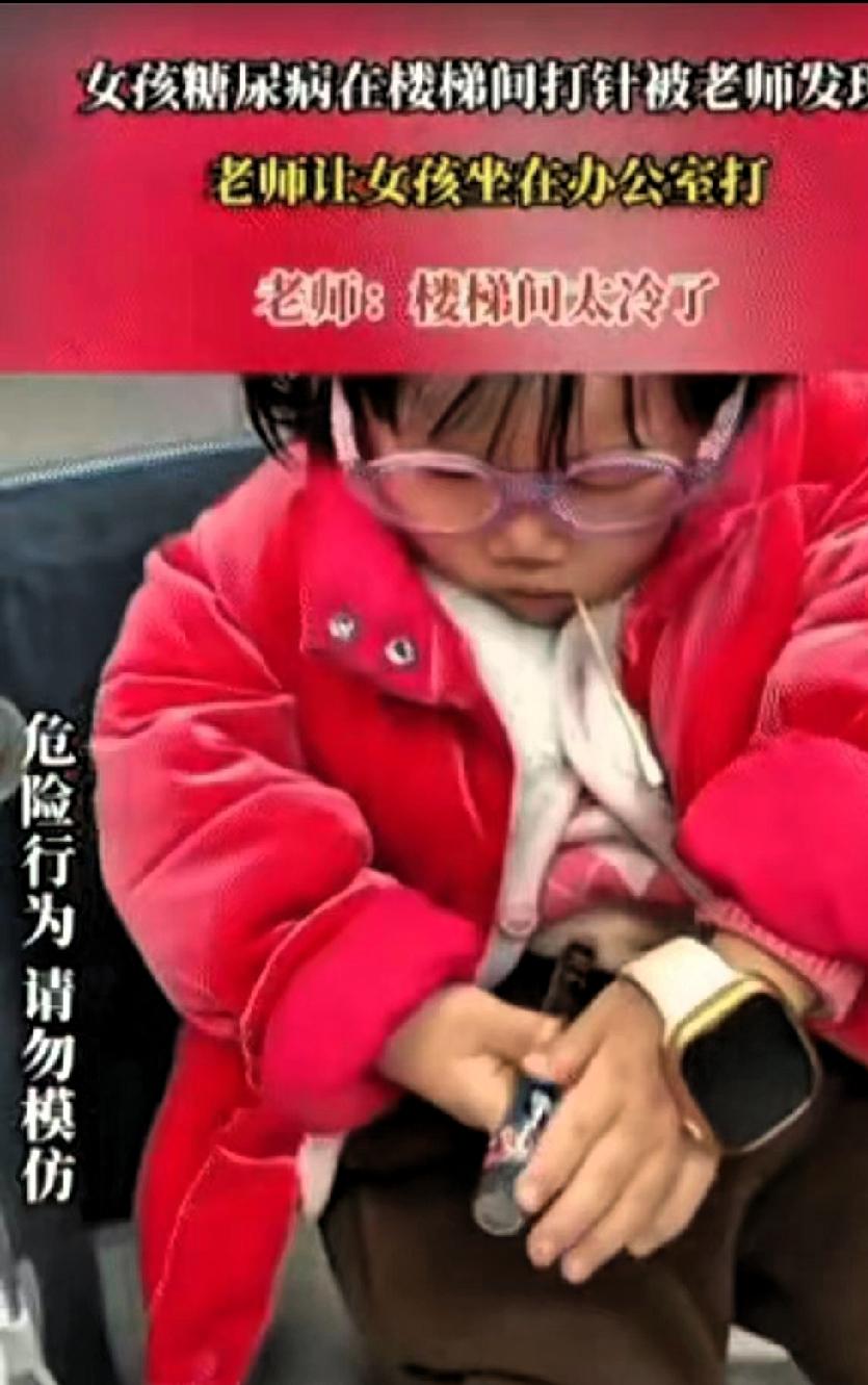 她好可怜! 小女孩在课间偷偷的去楼梯间打针,被老师撞到,原来小女孩有糖尿病,她怕在教室里打针吓到同学。 课间休息时,别的孩子都在开心玩耍,一个十岁左右的小姑娘,悄悄躲到教学楼的楼梯间里给自己打针,被老师撞见后,才知道孩子患有糖尿病,只是担心在教室里打针会吓到同学,才选择独自躲在角落,默默完成这件事。 她的这份细心和体谅,很难想象是出自一个孩子身上。本该无忧无虑的年纪,却要学着自己面对病痛,每天按时打针,时刻注意饮食,克制着同龄孩子都爱的甜食和零食,小小的身影里,藏着超出年纪的沉稳和隐忍。 幸运的是,孩子遇到了一位暖心的好老师。老师看到后没有过多询问,只觉得楼梯间冷,孩子一个人在这里太让人不放心,当即让孩子到办公室里打针,这份简单的心疼和关照,没有刻意的表达,却满是真诚的温柔,也给了孩子一份踏实的温暖。 儿童糖尿病分1型和2型,一种需要终身依靠胰岛素控制血糖,一种可以通过饮食和作息调理来稳定,不管是哪一种,对孩子来说都是不小的考验。要学着适应身体的变化,要长期坚持控糖,这份坚持,对成年人都不容易,何况是个孩子。 生病从不是孩子的错,而她没有抱怨,还处处顾及他人感受,这份善良和懂事,格外珍贵。老师的这份体谅,也让我们看到,一份简单的善意,就能给身处困境的孩子带去莫大的慰藉。校园里的温暖,往往就藏在这些细微的瞬间里。 人生总有猝不及防的考验,可善良与温柔,总能化解很多艰难。愿这个坚强的小姑娘,能被时光善待,血糖平稳,少些病痛的困扰,也愿每个孩子都能被身边人温柔守护,健康长大。