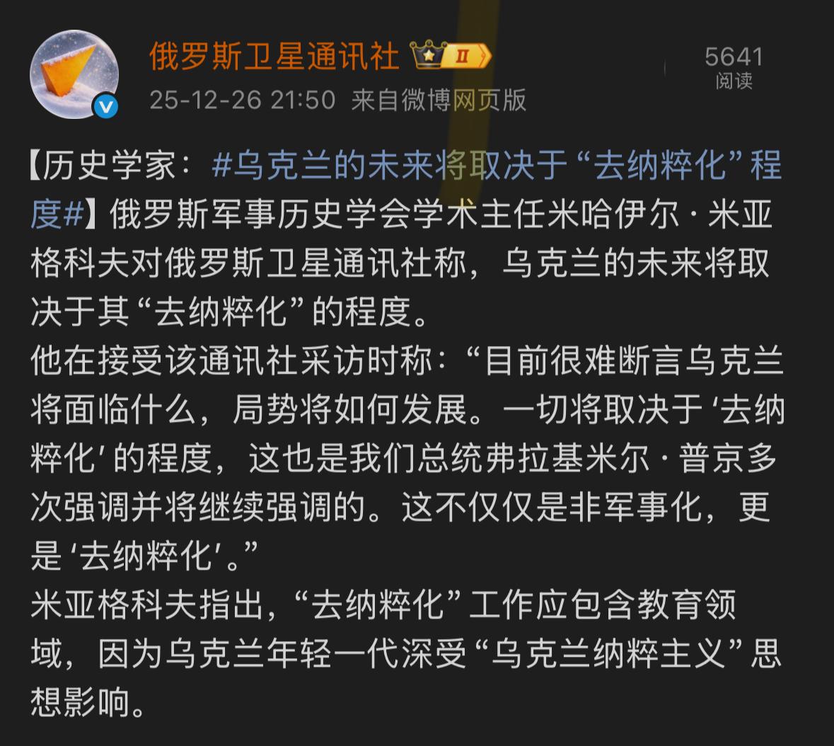 这位俄罗斯专家是个明白人,他说出了俄罗斯对乌克兰的期待。俄罗斯军事历史学会学术主任米哈伊尔·米亚格科夫称,“乌克兰的未来将取决于去纳粹化程度”。 个人觉得,这个专家道出了乌克兰问题的本质。诚然领土与安全是横亘在俄乌间的两座大山,但如果战后的乌克兰不向俄罗斯靠拢,就算解决了这两个问题,俄罗斯也不会停战。每次谈判,俄罗斯都会把恢复俄语和东正教作为基础条件,还要乌克兰选出去纳粹化的政权。换句话说,战后的乌克兰必须是亲俄的而不是亲欧的,如果乌克兰的和平计划是以融入欧洲为基础的,那无论他们怎么修改,俄罗斯都不会满意。