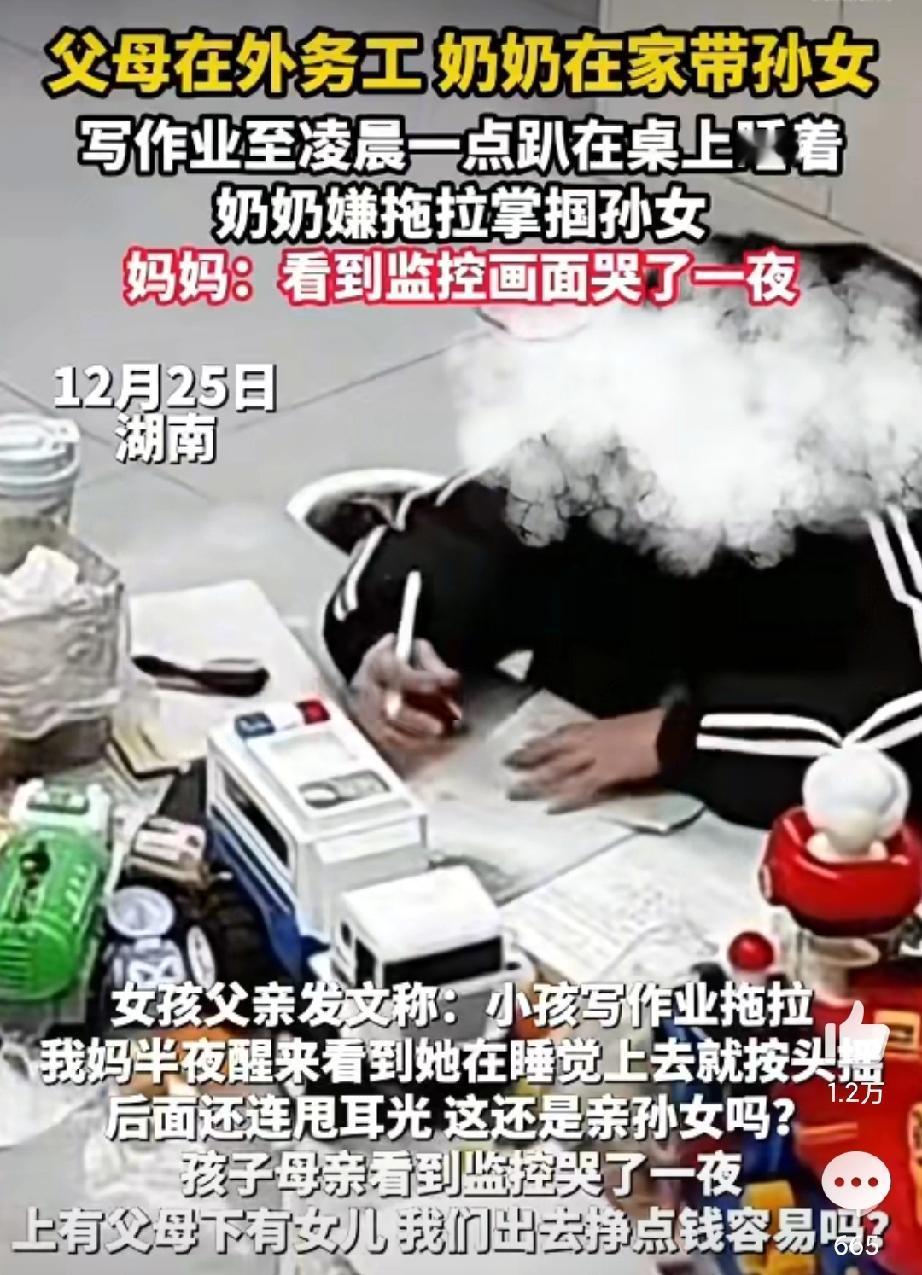 太气人了,真是让人血压飙升! 凌晨一点女孩写作业熬到睡着,已经够拼够累了,亲奶奶居然下得去手按头摇连续掌掴?这哪是疼孙女,分明是把自己的烦躁和压力全撒在孩子身上! 网友辣评:还发到网上,不应该回家解决吗?难道让网友隔空打这个奶奶? 女孩父亲得知此事后发文痛诉,称孩子母亲看了监控哭了一整晚,直言自己上要赡养老人、下要抚育孩子,背井离乡挣钱本就不易,没想到孩子在家会遭遇这样的对待。 多少留守儿童的心酸,都藏在“父母务工,老人带娃”的常态里,缺的不只是陪伴,还有一份能护着孩子不被委屈的周全! 别说什么“为了孩子好”,叫醒她让她去睡觉,比抬手打她一百下都管用!
