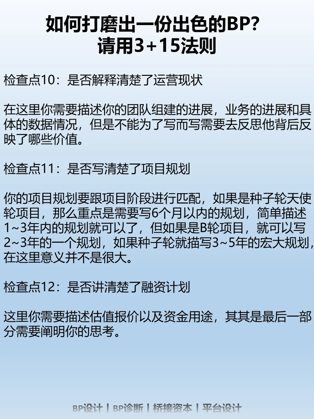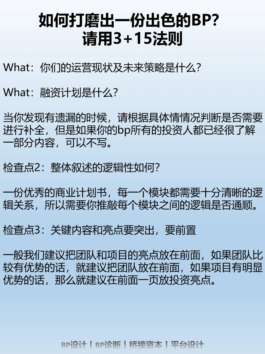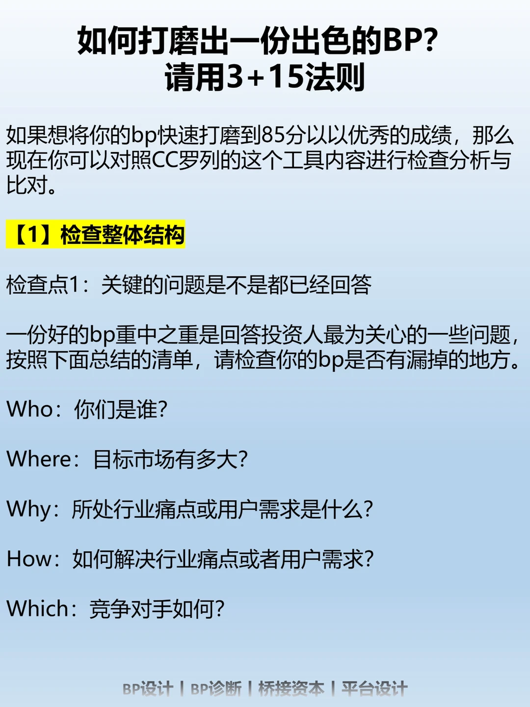 那么现在你可以对照CC总结罗列的3+15法则进行检验自己的商业BP内容