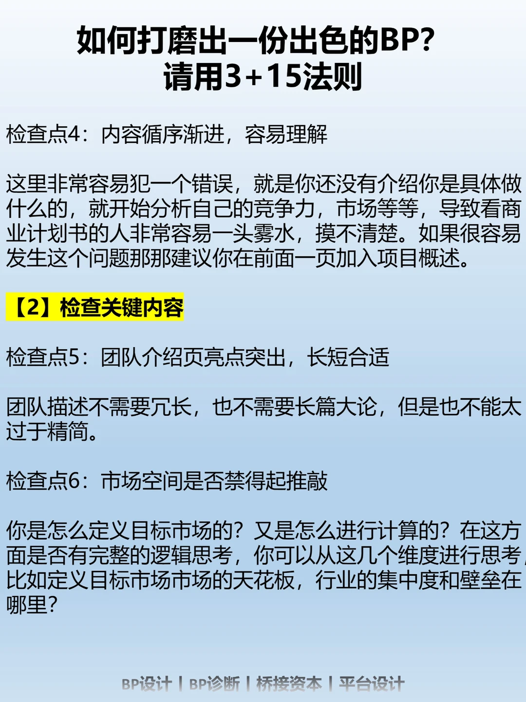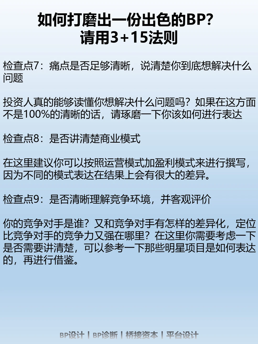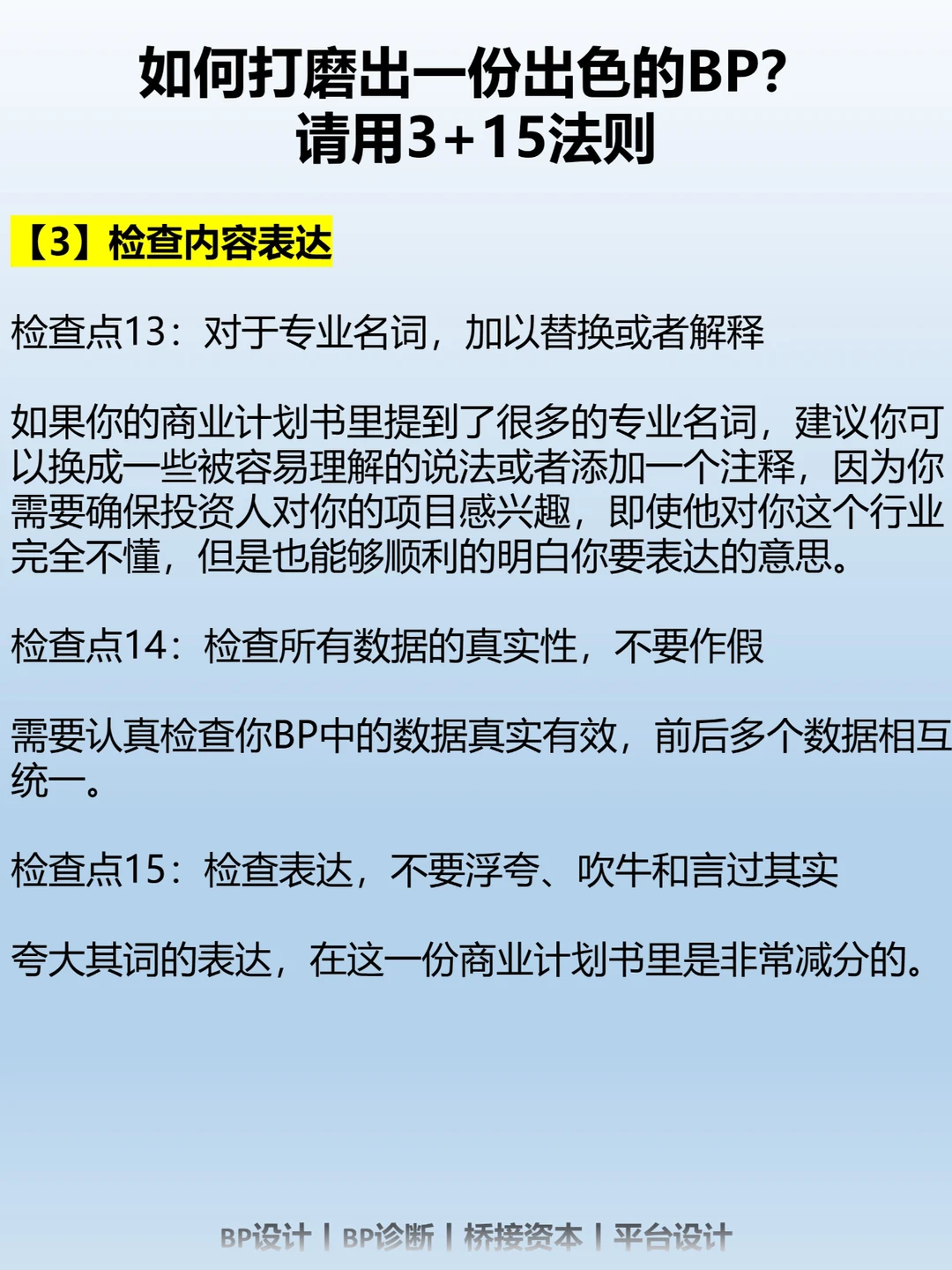 那么现在你可以对照CC总结罗列的3+15法则进行检验自己的商业BP内容