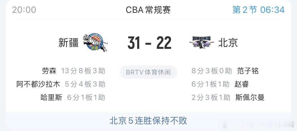 看看别人CBA联赛 新疆31:22北京。范子铭目前得分最高8分,你敢信?