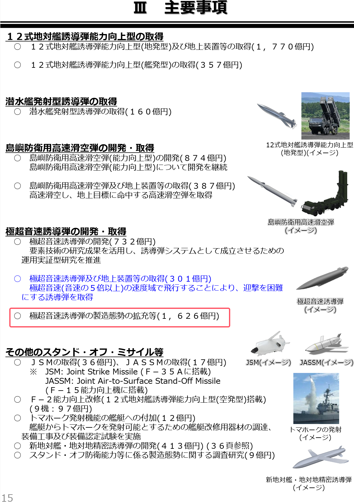 跟概算请求案相比,令和8年度防卫预算防区外打击能力:9733亿(砍了513亿)——12SSM-ER陆基型:1770亿(砍了28亿)——12SSM-ER海基型:357亿(砍了5亿)——潜射型SSM:160亿(砍了2亿)——岛屿防卫用高速滑空弹(能力向上型)开发:874亿(砍了10亿)——岛屿防卫用高速滑空弹:387亿(砍了5亿)——极超音速导弹开发:732亿(砍了10亿)——极超音速导弹采购:301亿(砍了4亿)——极超音速导弹生产设施扩充:1626亿(请求案没有列出这条)——JSM:36亿(砍了28亿)——JASSM:17亿(不变)——F-2搭载12SSM-ER空基型改修:9架97亿(砍了36亿)——DDG搭载战斧改修:12亿(不变)——新地对舰·地对地精密导弹开发:413亿(砍了5亿)——防区外打击能力生产态势相关调查研究:9亿(不变)