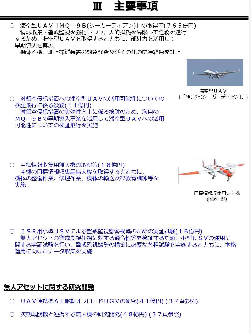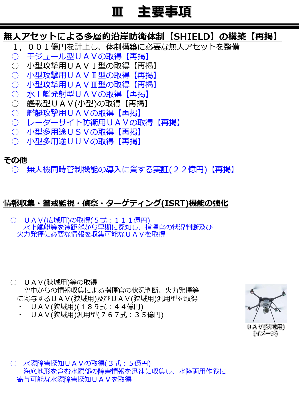 跟概算请求案相比,令和8年度防卫预算无人系统防卫能力:2773亿(砍了355亿)——SHIELD系统:1001亿(砍了286亿)——无人机同时管制技能验证:22亿(砍了1亿)——UAV(广域用):5架 111亿(不变)——UAV(狭域用):189架 44亿(砍了5亿)——UAV(狭域用)泛用型:767架 35亿(砍了4亿)——水际障害探知UAV:3架 5亿(数量砍了3架,金额砍了2亿)——MQ-9B:4架及地面操控系统 765亿(砍了5亿)——MQ-9B用于对侵犯领空目标处理的验证试验:11亿(新增)——目标情报收集用无人机:4架 18亿(砍了2亿)——ISR用小型USV警戒监视体系的验证试验:16亿(砍了4亿)——与UAV联动AI驱动型越野UGV研究:41亿(砍了4亿)——与GCAP联动的无人机研究:48亿(砍了1亿)