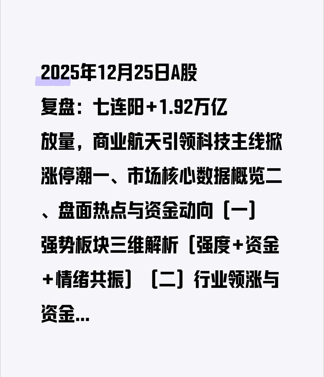 2025年12月25日A股复盘:七连阳+1.92万亿放量,商业航天引领科技主线掀涨停潮 一、市场核心数据概览 项目 具体数据 市场意义 上证指数 3959.62点(+0.47%) 日线七连阳,上升趋势强劲 深证成指 13531.41点(+0.33%) 跟随沪指上涨,顺利翻红 创业板指 3239.34点(+0.30%) 止跌回升,收复前期失地 两市成交额 1.92万亿元(放量443亿) 量价配合健康,增量资金入场 市场涨跌分布 上涨股票近3800只 普涨格局显现,赚钱效应扩散 涨停个股数量 近百股涨停 市场情绪活跃,风险偏好显著提升 二、盘面热点与资金动向 (一)强势板块三维解析(强度+资金+情绪共振) 板块 强度值 涨跌幅 涨停家数 主力净流入 核心解读 商业航天 30722 +3.75% 24家 48.3亿 绝对主线,强度与资金流入断层领先,涨停潮凸显 军工 25682 +2.49% 21家 38.4亿 与商业航天高度联动,板块效应显著 机器人概念 24238 +1.88% 14家 41.1亿 资金深度介入,延续近期强势表现 人形机器人 21943 +3.03% - 36.0亿 细分领域弹性更高,资金关注度升温 (二)行业领涨与资金流向 1. 领涨行业:航天航空(+3.93%)、电机(+3.25%)、造纸印刷等,高端制造与周期板块协同发力; 2. 主力资金净流入TOP3:航天航空(28.7亿)、汽车零部件(27.9亿)、通用设备(23.7亿),资金紧扣制造主题; 3. 调整板块:贵金属、能源金属跌幅居前,资金从防御性板块流出,转向进攻性成长赛道。 三、市场核心脉络与关键看点 1. 技术面强势确立: 沪指七连阳叠加成交额放量,多头情绪主导市场,上升趋势信号明确; 2. 主线极致聚焦: 赚钱效应集中于商业航天(卫星互联网、空间站)及机器人产业链,九鼎新材等龙头连板打开上涨空间; 3. 量能支撑行情延续: 1.92万亿成交额为行情提供坚实基础,增量资金入场承接意愿强烈; 4. 宏观利好强化信心: 离岸人民币升破7.0稳定资产价格、美国暂停对华芯片新关税,双重利好缓解科技板块外部压力。 四、后市展望与核心观察点 观察维度 具体看点 主线持续性 商业航天、机器人板块连板梯队(如九鼎新材)强度能否维持,为市场热度风向标 量能稳定性 成交额能否保持1.8-2万亿活跃水平,是普涨行情延续的关键 板块轮动节奏 资金是否从核心主线向半导体、AI等科技细分或低位板块扩散 政策与外部环境 央行适度宽松货币政策基调及外部贸易环境变化 综上,今日A股量价齐升走出强势普涨格局,科技成长主线明确且强度突出。操作上,可顺应七连阳趋势,重点紧盯主线板块强度与成交量变化,把握结构性机会。