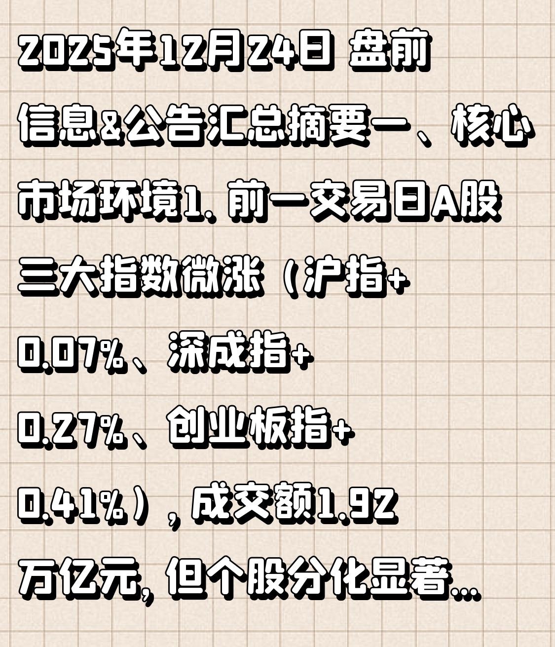 2025年12月24日 盘前信息&公告汇总摘要 一、核心市场环境 1. 前一交易日A股三大指数微涨(沪指+0.07%、深成指+0.27%、创业板指+0.41%),成交额1.92万亿元,但个股分化显著(3856只下跌、1512只上涨),北向资金小幅净流入。 2. 外围美股三大指数收涨,离岸人民币升破7.02创14个月新高,外资回流动力增强。 3. 今日大盘预期零轴附近开盘、全天震荡,策略建议轻指数重个股,把握主线机会并规避减持风险。 二、重磅利好与核心板块 1)政策&产业利好 1. 无人驾驶: 北京发放国内首批L3级高速公路自动驾驶专用号牌,标志行业迈入量产落地新阶段,2025年中国市场规模预计突破4500亿元,利好北汽蓝谷、四维图新等。 2. 液冷服务器: 英伟达GB300 AI服务器机柜明年出货量预计增129%,全球AI巨头加速液冷技术应用,2025年为行业爆发元年,相关公司川润股份(002272)、冰轮环境、英维克(002837)等受机构加仓。 3. 外资引入:深圳出台22条外资新政,最高奖励1.5亿元吸引高端产业外资,聚焦先进制造、生物医药等领域,利好本地产业链企业。 4. 学前教育+母婴消费:三部门规范幼儿园收费,杜绝隐形收费减轻育儿负担,利好威创股份、贝因美、孩子王等。 2)市场&公司利好 1. 2025年A股分红2.63万亿+回购1383亿+增持890亿,合计资金面支撑强劲。 2. 中芯国际部分产能涨价10%,半导体产业链需求回暖;中国核电与核动力院签署核电厂功率提升协议。 3. 建龙微纳子公司拟2亿元收购汉兴能源40%股权,万向钱潮2026年将建成120万套机器人专用轴承产能。 三、利空风险提示 1. 商业航天: 长征十二号甲运载火箭首飞任务中,二级精准入轨但一级火箭再入阶段发动机重启异常,未能成功回收,板块指数大跌近2.5%,超15只个股跌幅超9%,短期情绪受压制。 2. 减持潮: 紫光股份、航宇微、壹网壹创等多家公司披露股东减持计划,涉及多板块,短期或引发个股抛压。 3. 个股风险: 东方雨虹美国全资子公司OYH建材公司(补充主体)遭电信诈骗,因邮箱被入侵伪造身份付款损失1211.8万元(补充细节); 昊海生科控股股东因内幕交易被罚1462.92万元; 利柏特澄清不涉及可控核聚变业务。 四、今日关注主线&支线 1. 主线:海南免税(海汽集团、海南发展)、机器人概念、锂电池储能、消费、商业航天、海西概念。 2. 支线:液冷、节能环保、半导体、光刻机胶、光伏、核电、智能驾驶。 以上内容根据公开资料整理,仅供参考。股市有风险,投资需谨慎。