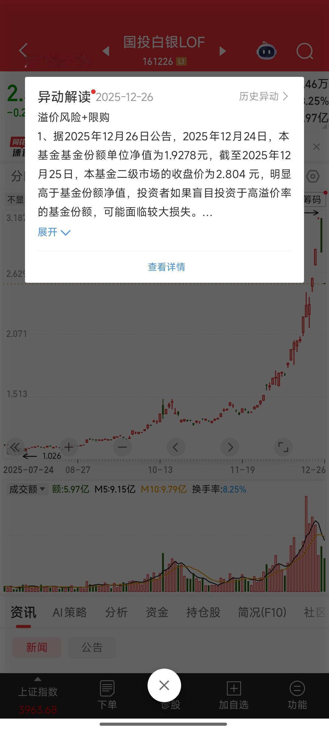 A股今天最惨的基金诞生了 秒砸跌停,真是活久见呀 该基金十点半复牌,开盘后直线跌停 3.28亿资金一涌而出,把车门焊的死死的 全天成交额5.97亿,板上还有12.8亿资金在排队 跌停的原因很简单,就是溢价太高了 昨日的基金净值为1.9278元 昨日的二级市场收盘价为2.804元 大幅高于基金份额净值 巴菲特说过,别人贪婪我恐惧 人声鼎沸的时候,往往蕴含着大的风险