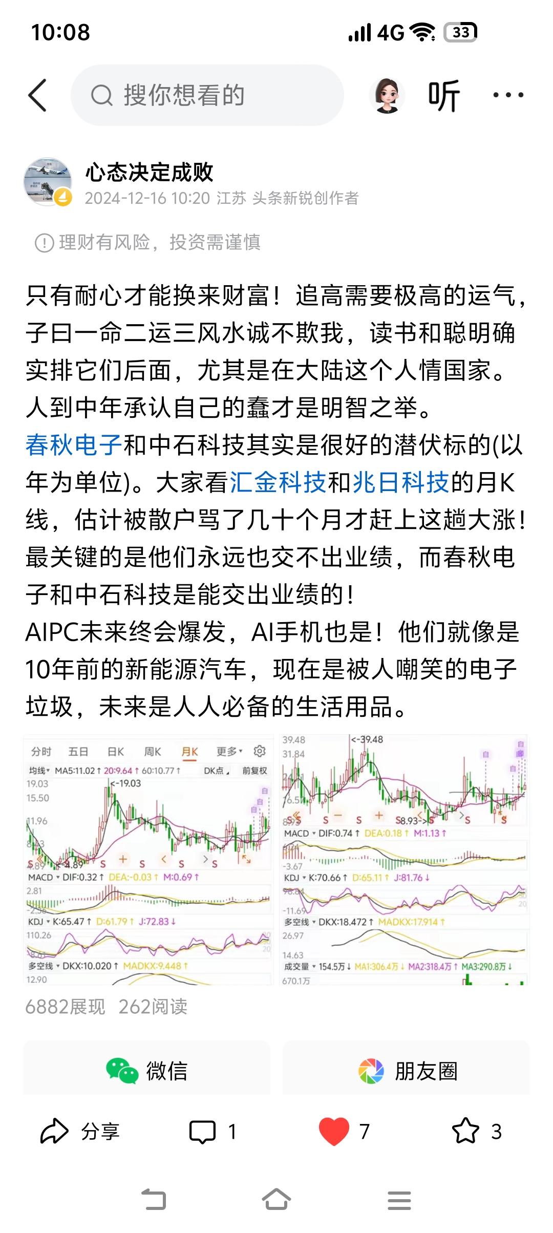 前天发大富科技的时候我也想到了此股[黑线] 可是我看大富科技吹商业航天,我以为庄家会搞一波呢!唉! 春秋电子,如此爆炸的业绩,如此低的市值,今天终于明白了,缺个好的故事来吸引强庄。之前都是没格局的小卡了米,套点利就跑。 今天开始,确定已经有新庄家进去运作了!未来100元股价妥妥的!