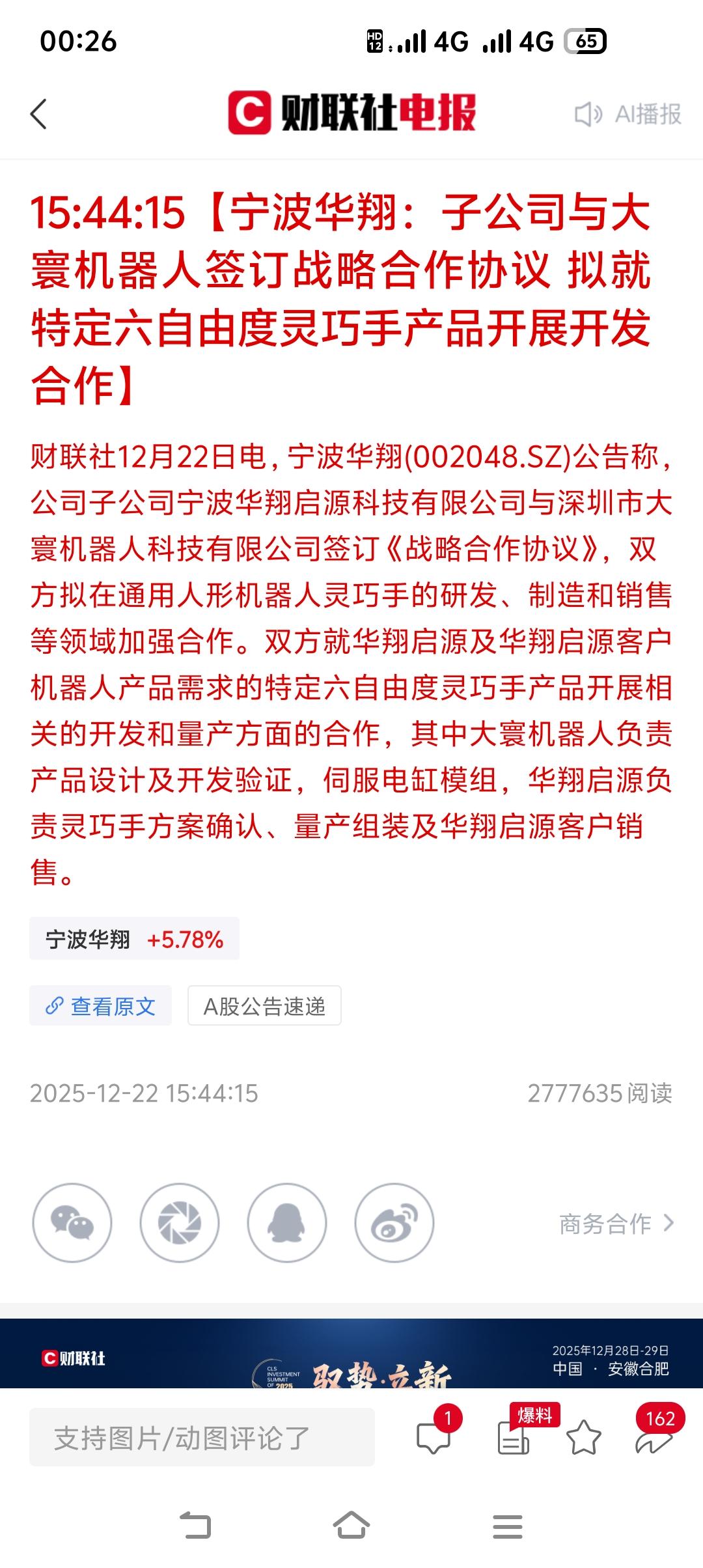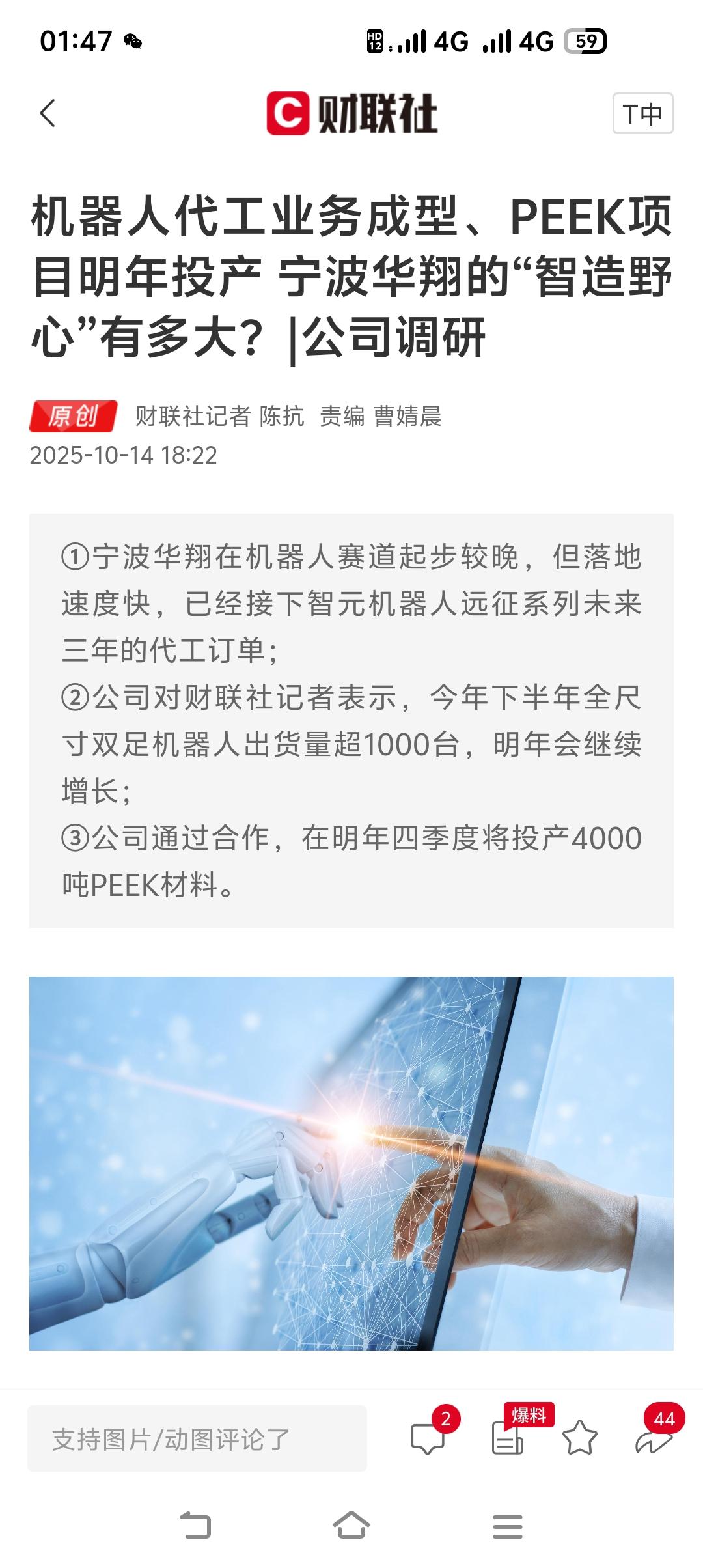 三丰智能也属于机器人板块,回调了挺长时间!可以看到周一和周四都放量拉升了!看此股月线是回调了10个月! 而有些机器人股已经在之前就异动了,譬如昊志机电,力星股份等,长盈精密则没有怎么回调。 要是以前,三丰智能这样的股可以大胆干!今天,就算你选对了板块,如何选个股也伤透了脑筋! 以前发过宁波华翔的帖子,此股和双林股份一样,都是机器人行业后行者!双林股份前面一波强的一笔,这股会复制吗?你到财联社搜索帖子,此股质地是不错的,不仅替智元机器人代工,还投资建设peek,和其他厂一起合作开发灵巧手。 长期拿住宁波华翔,我觉得不会比中大力德差。