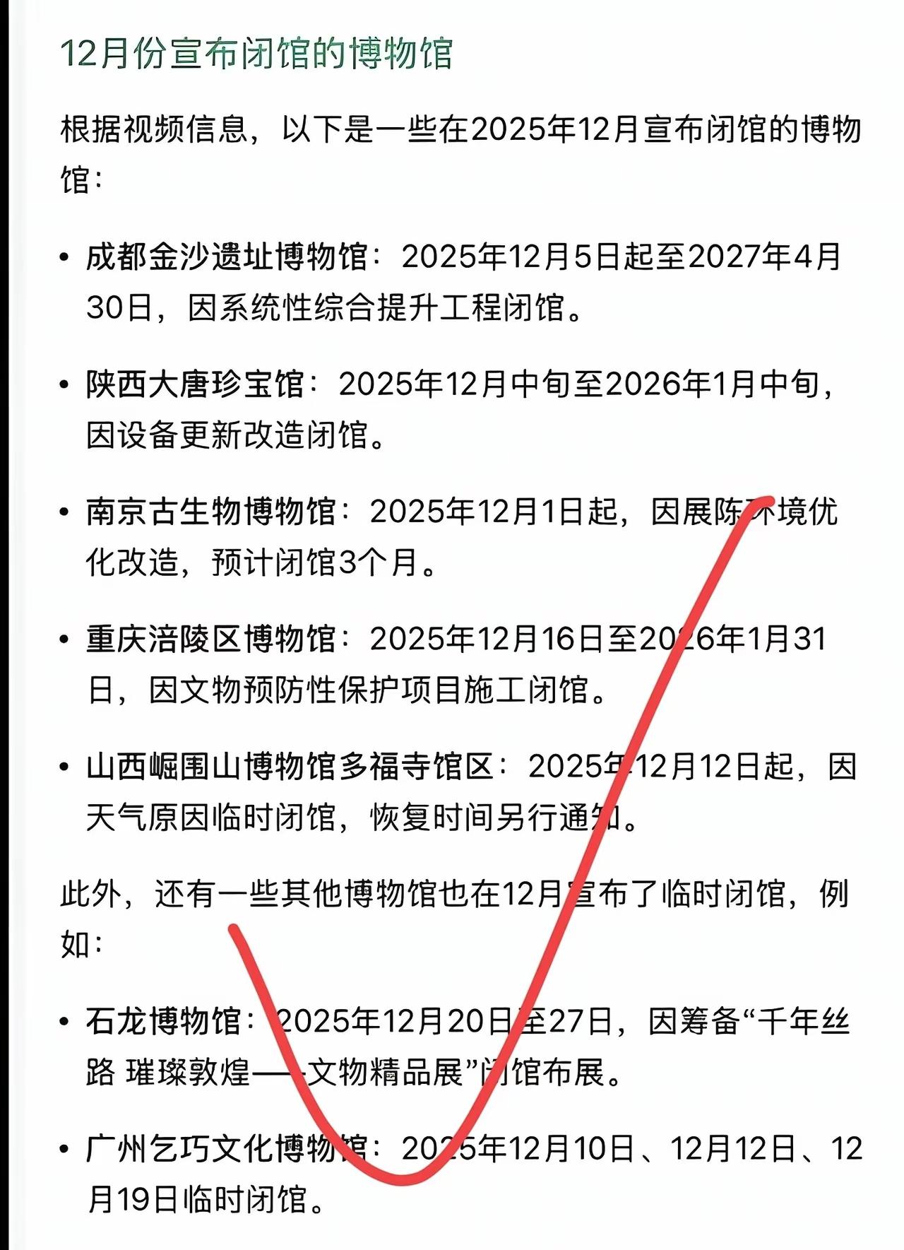 南博事件仍在持续发酵。颇为巧合的是,12月期间,各大博物馆纷纷宣布闭馆维修,闭馆时长不等,长则可达2年,短则三五个月。 故而,建议在施工期间,务必做好施工精细化管理,尤其要抓好博物馆的防火工作,这乃是重中之重,绝不能让珍贵文物毁于一旦。 全国博物馆众多,每月都会有几家闭馆整修。在此强烈呼吁各地的朋友们,行使公民监督权,监督一下当地博物馆是否“又要”闭馆。
