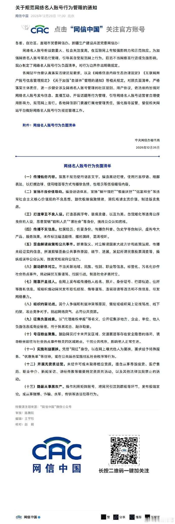 12月26日,中央网信办发布关于规范网络名人账号行为管理的通知。