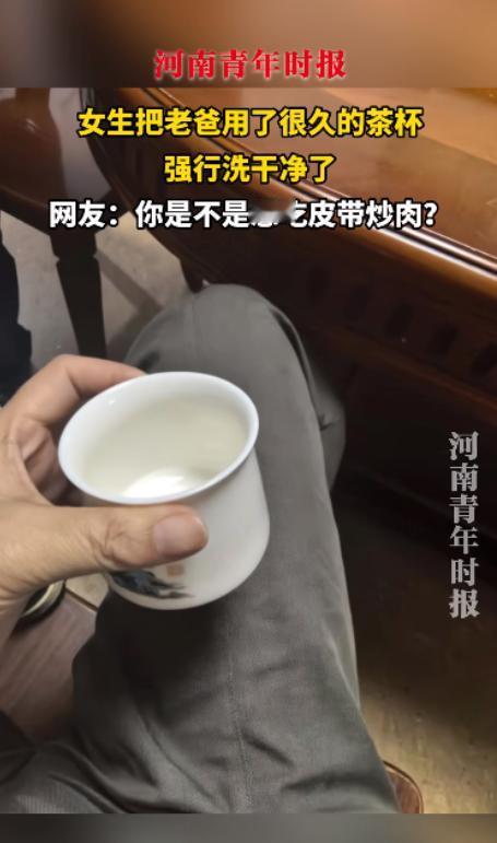 “闯出大祸了!”10月24日,福建,一女孩看见自己老爸的茶杯喝了很久都不洗,觉得实在是太不卫生了,于是直接用清水费了很大功夫才把茶杯洗干净,没想到网友看到这一幕却纷纷表示女儿要“挨打”了! 信息来源:《女生把老爸用了很久的茶杯强行洗干净了,网友:你是不是想吃皮带炒肉?》河南广播电视台 这个陪伴爸爸走过十年光阴的瓷杯,早已不是普通的饮水工具。原本洁白的杯壁被层层茶渍染成深褐色,摸起来还有种滑溜溜的触感。爸爸每天的生活,都是从捧着这个杯子泡茶开始的,茶香里藏着他的日常。 对女儿来说,厚厚的茶垢意味着细菌和健康隐患,清洗是理所当然的孝心。她找来了洗洁精和软布,反复擦拭,还用温水浸泡,手都擦酸了才让杯子恢复原本的洁白模样,满心期待爸爸的夸奖。 可爸爸接过杯子后,只是盯着内壁发呆,手指在冰凉的瓷面上轻轻摩挲。那个陪伴他无数个清晨、见证过独处与欢聚的 “老伙计”,突然变得陌生,连带着茶水里熟悉的醇厚感也仿佛消失了。 网友们的评论瞬间炸了锅,不少人调侃女儿 “要挨皮带炒肉”,更多人则分享了自家类似的经历:有人扔了妈妈用几十年的菜板,让妈妈难过了好几天;有人修好爸爸的旧收音机,让老人高兴得像个孩子。 其实这场小风波的背后,藏着两代人对生活的不同理解。年轻人讲究科学卫生,觉得茶垢积累会滋生霉菌,影响健康,这并不是多余的担心 —— 茶垢主要是茶多酚聚合物,虽然不致癌,但长期不清洗确实会成为细菌温床,尤其对肠胃敏感的人不友好。 可在老一辈眼里,这个带茶垢的杯子早已超越了实用价值。老茶客们都知道,用惯了的老杯子泡出的茶味道更醇,那些沉淀的茶垢里,藏着十几年的时光记忆,是独属于自己的生活印记。 这种对旧物件的眷恋,在心理学上被称为 “情感具身化”,旧物件就像时光胶囊,触摸它们就能唤醒藏在心底的回忆。 老一辈成长于物质匮乏的年代,对物品的感情格外深厚,不是舍不得花钱买新的,而是那些用惯了的东西,都带着生活的温度。 年轻人追求健康便捷的现代生活,想法同样无可厚非。这从来不是谁对谁错的问题,而是两代人站在不同角度的爱与关心。 就像有网友说,自己曾执意扔掉奶奶的旧棉袄,后来才知道那件衣服是爷爷当年省吃俭用给奶奶买的定情物。 家庭里的很多小摩擦,都源于这种观念上的差异。关键不在于说服对方,而在于是否愿意倾听彼此的心声。 女孩后来和爸爸好好聊了聊,才明白杯子里藏着的时光故事,爸爸也理解了女儿担心健康的孝心,这场小误会就此化解。 现在爸爸依然用着那个干净的杯子,只是女儿会定期帮忙清洗,不让茶垢积太厚,而爸爸也渐渐习惯了这份 “清爽的茶香”。 生活里的亲情,往往就藏在这些不起眼的小事里。老一辈珍惜旧物件,是珍惜时光里的情感;年轻人追求新观念,是希望长辈过得更健康,本质上都是沉甸甸的爱。 快节奏的生活让家人相处的时间越来越少,很多时候,正是这些小插曲,让我们有机会走进彼此的内心。那些看似 “不可理喻” 的坚持背后,可能都藏着没说出口的深情。
