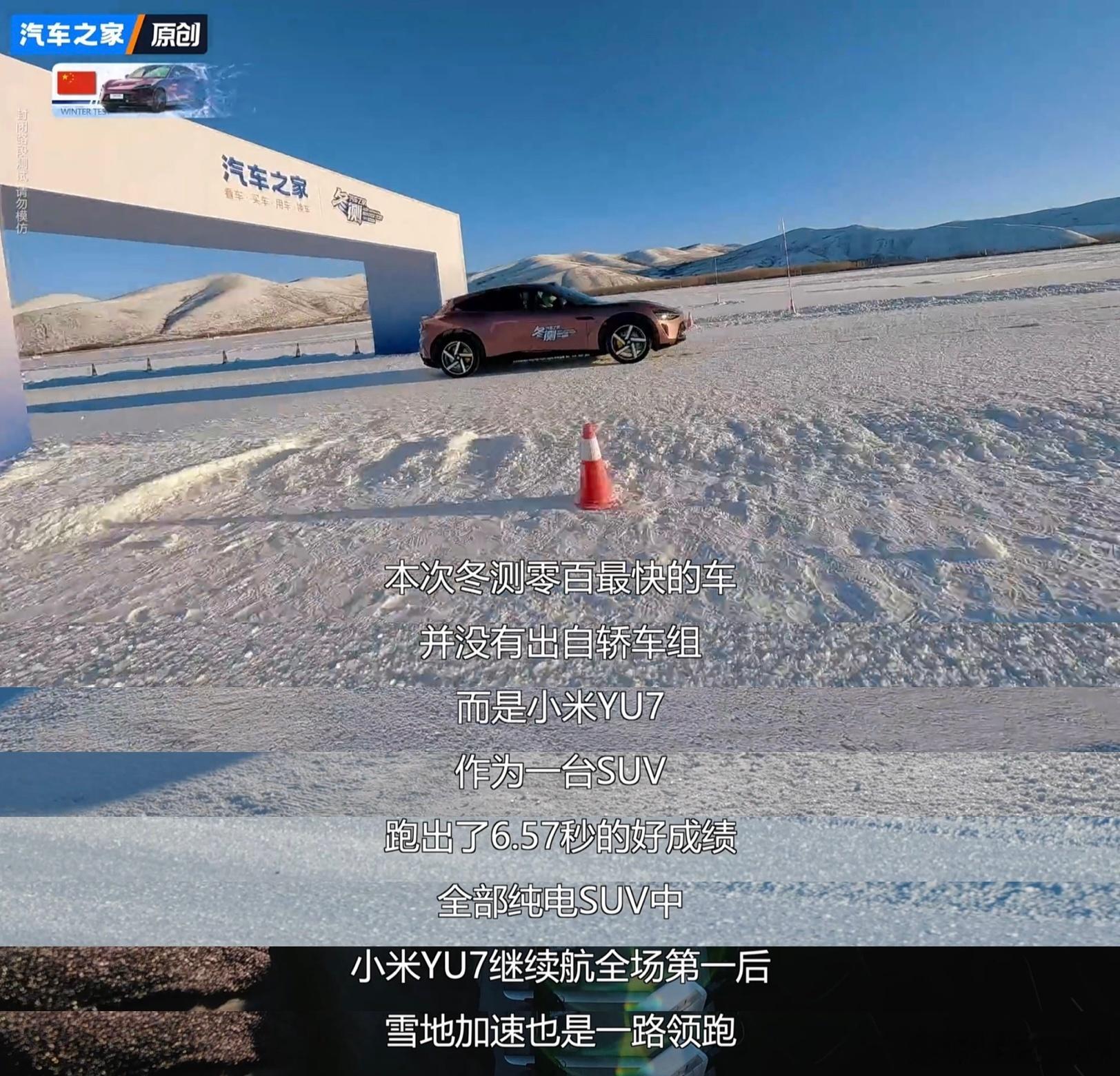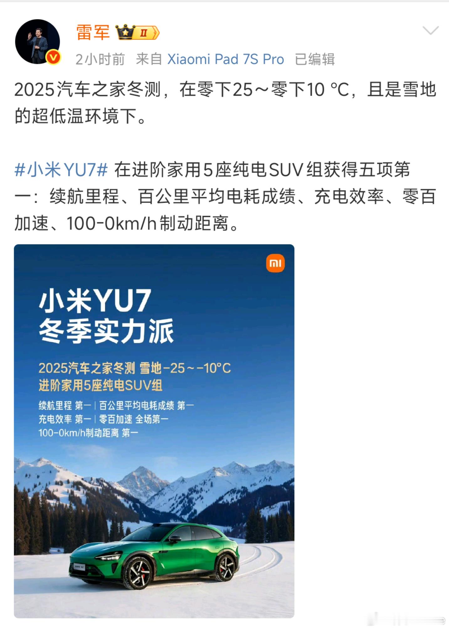 小米YU7冬季实测五项第一之前汽车之家准冬测(北京3-13℃环境)下,小米YU7续航和续航达成率双第一,当时有很多人质疑天气不够冷,我就说过肯定会有媒体测试更冷的天气的。现在汽车之家在零下25~零下10℃雪地环境下,小米YU7获得进阶家用5座纯电SUV续航第一、平均电耗第一。还有充电效率、零百加速、百公里时速制动距离都是第一。这回黑子应该没话说了。不管一般寒冷还是极寒,小米YU7通通拿下,续航牛的同时续航达成率也出色,这也能看出小米三电的实力在行业内绝对是领先的。 雷军回应小米YU7冬测成绩
